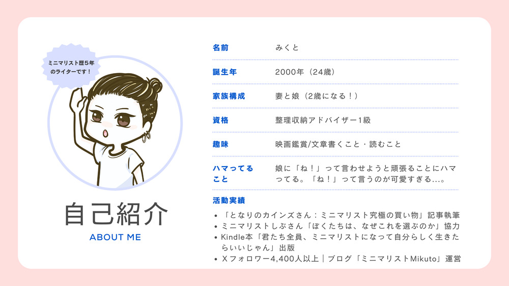 みくと:ミニマリスト歴5年/23歳でフリーのライターに転身。ミニマリストとしてSNSやブログで発信活動を行いながら、2025年1月にKindle本を出版。