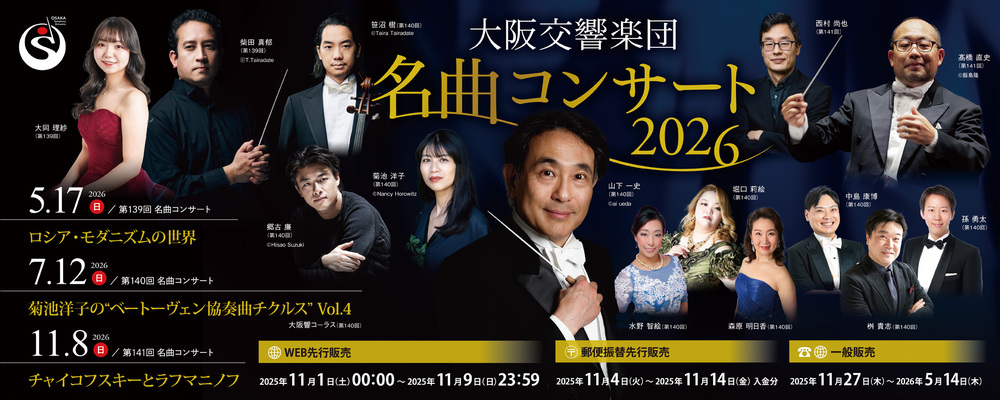 大阪交響楽団 2026年度名曲コンサートの最初を飾る今回の公演は、堺市新人音楽コンクールで最優秀賞を受賞しました大同理紗さんをソリストにお迎えし、弊団ミュージックパートナーの柴田真郁の指揮でプロコフィエフづくしのプログラムをお送りいたします。