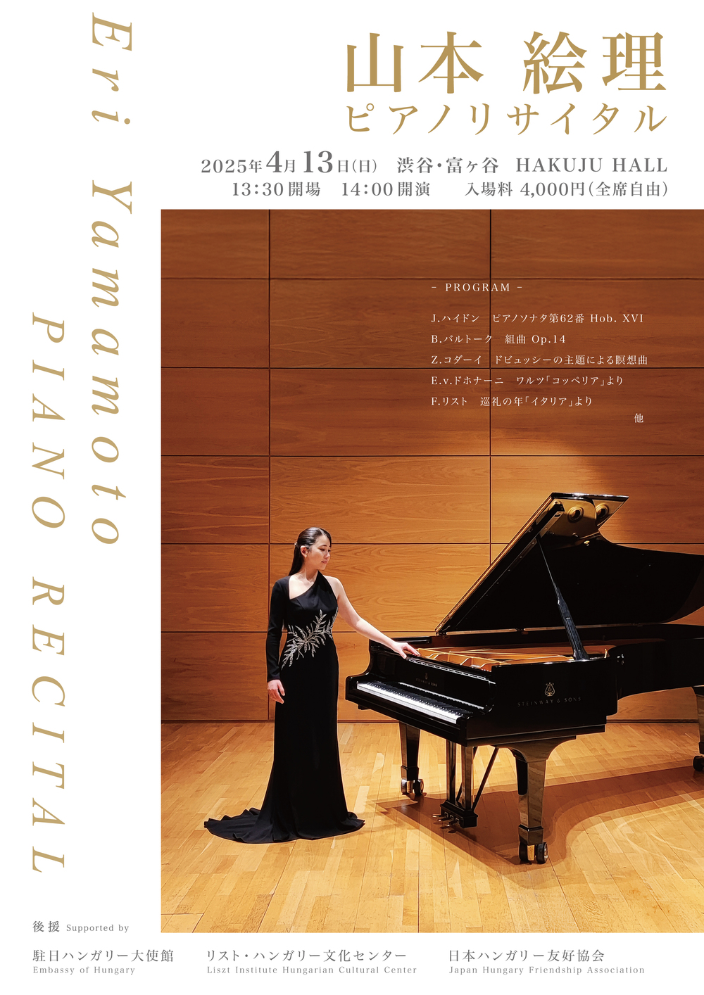 2025年4月13日に開催される山本絵理ピアノリサイタルは、緻密な技巧と豊かな表現力で、ハイドン、バルトーク、コダーイ、ドボナーニ、リストといった巨匠の名作を余すところなく披露します。全席自由の会場で、観客と心を通わせながら、各作品の背景や歴史にも触れた解説が行われ、クラシック音楽の深淵な魅力が堪能できる一夜となることでしょう。演奏者の洗練されたピアノ技術が、伝統と革新の融合を感じさせ、聴衆に感動と新たな発見を提供します。