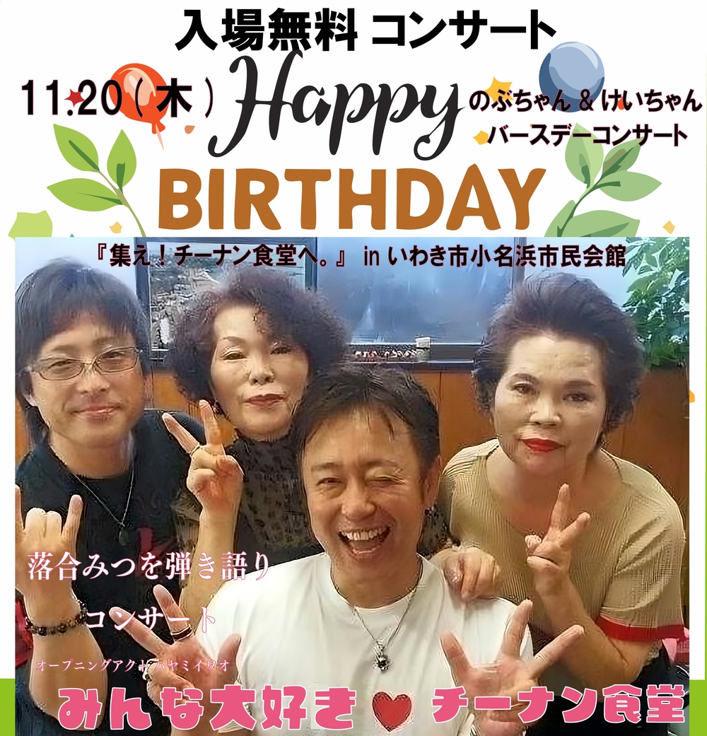 落合みつをの愛するチーナン食堂の美人姉妹「のぶちゃんけいちゃん」の誕生日を落合みつをコンサートで祝う企画