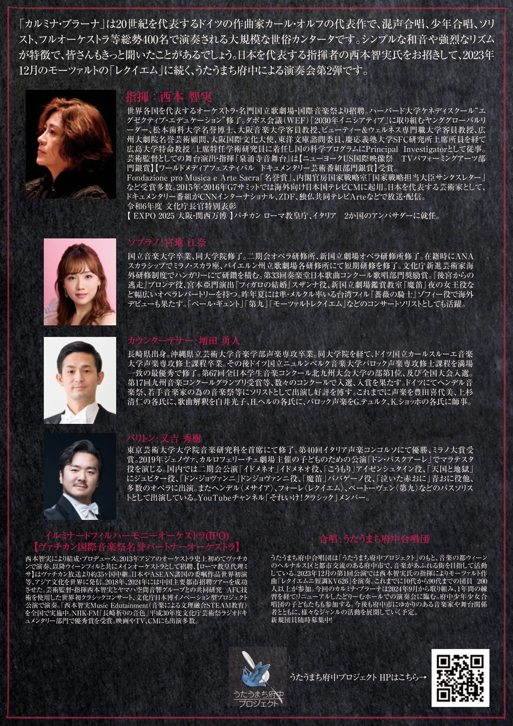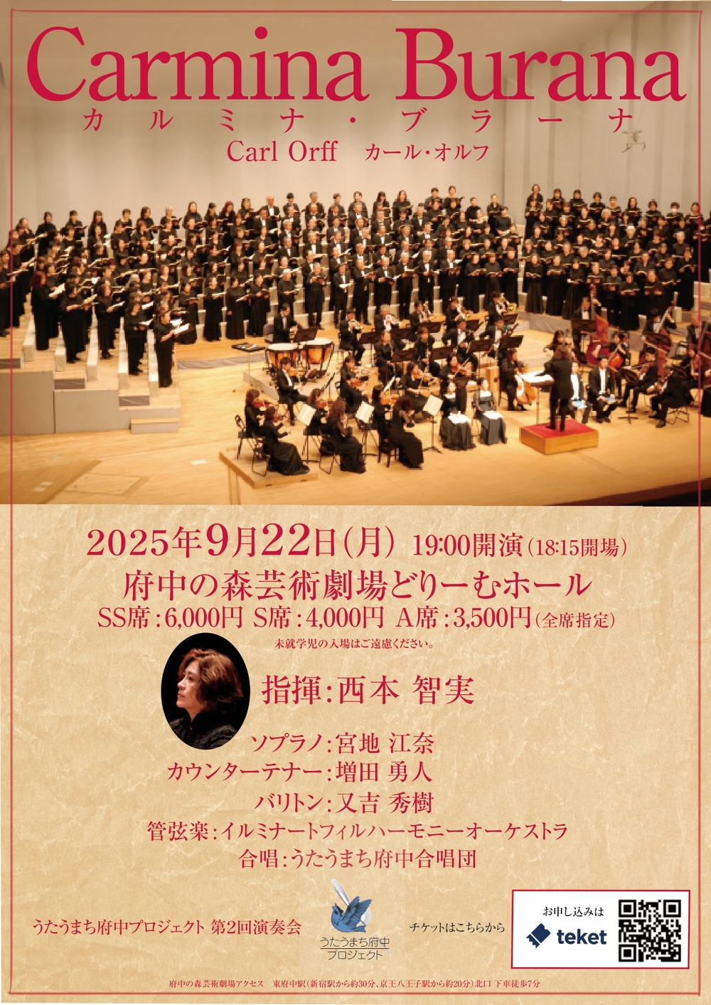 「カルミナ・ブラーナ」は20世紀を代表するドイツの作曲家カール・オルフの代表作で、混声合唱、少年合唱、ソリスト、フルオーケストラ等総勢200名で演奏される大規模な世俗カンタータです。シンプルな和音や強烈なリズムが特徴で、皆さんもきっと聞いたことがあるでしょう。日本を代表する指揮者の西本智実氏をお招きして、2023年12月のモーツァルトの「レクイエム」に続く、第二弾のうたうまち府中による演奏会です。