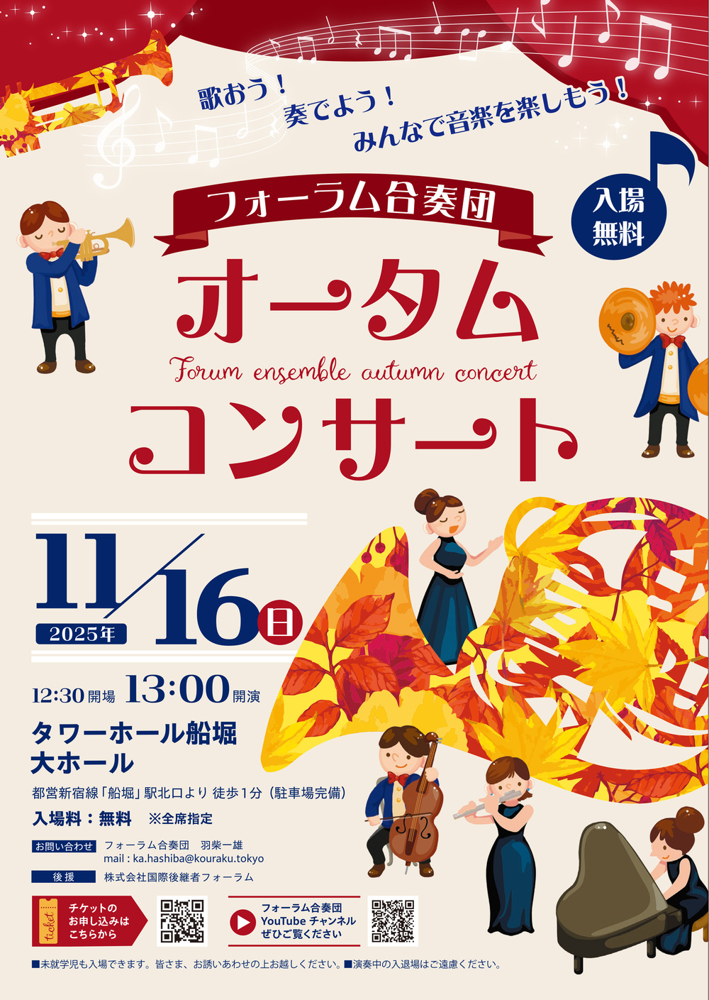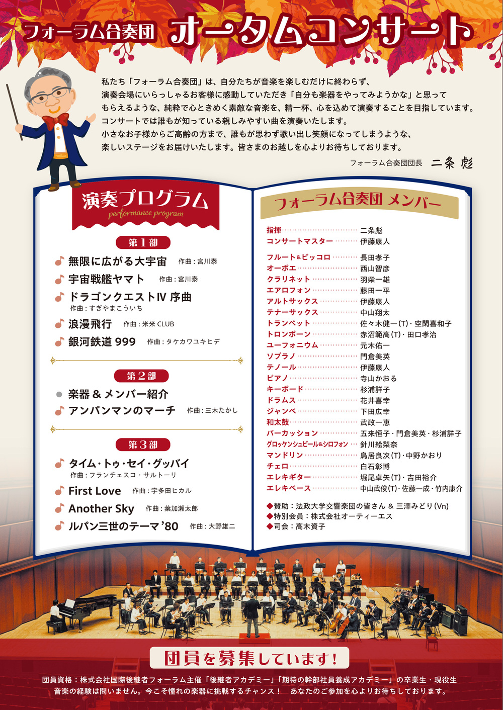 私たち「フォーラム合奏団」は、自分たちが音楽を楽しむだけに終わらず、演奏会場にいらっしゃるお客様に感動していただき「自分も楽器をやってみようかな」と思ってもらえるような、純粋で心ときめく素敵な音楽を、精一杯、心を込めて演奏することを目指しています。