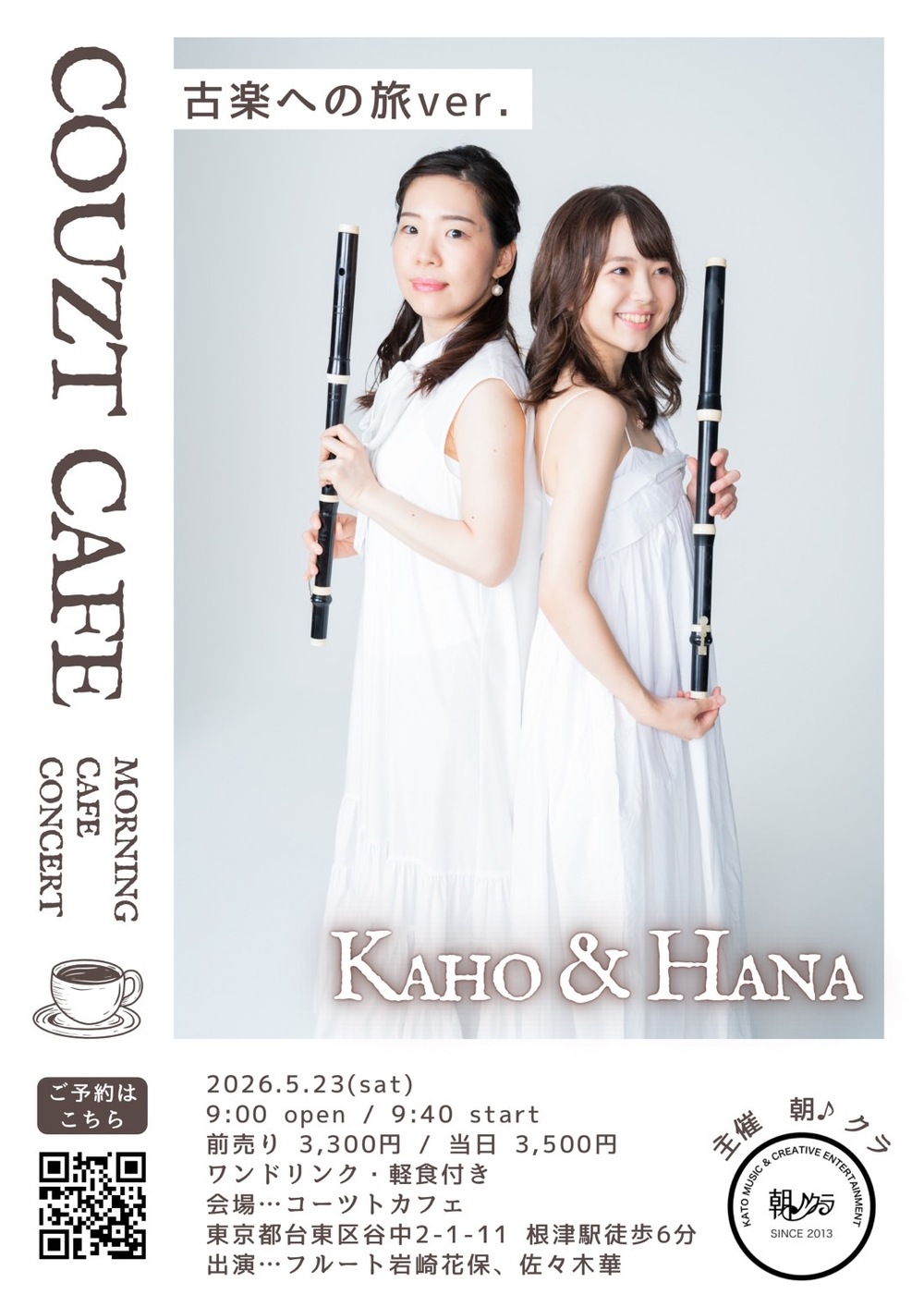 昨年に続き朝♪クラのモーニングカフェコンサート企画、今回は"古楽への旅"をテーマに台東区・根津にあるコーツトカフェさんでの開催です。青いひさしと大きな窓が目印で、ヴィンテージ風の家具や小上がりの席がある落ち着いた素敵なカフェで皆様をお待ちしています。