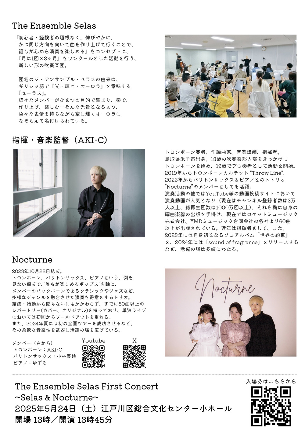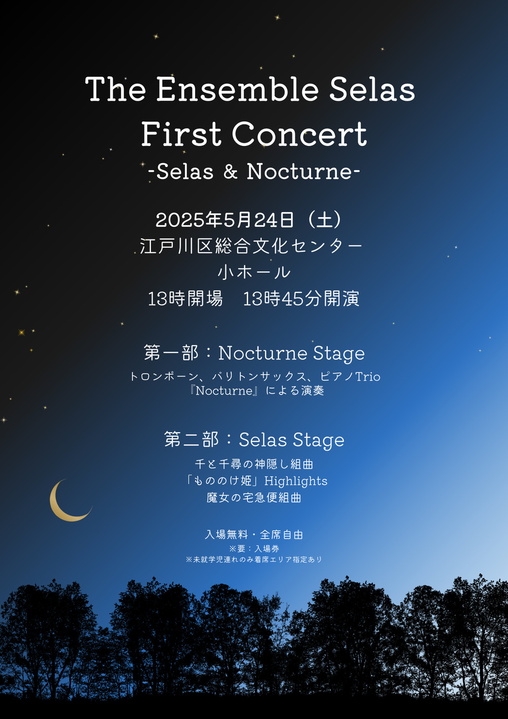 ジ・アンサンブル・セラスは、誰もが負担の少ない活動回数『月に1回×3ヶ月でワンクール』とした新形式の吹奏楽団です。 「演奏を楽しむ」「音楽づくりを楽しむ」ことを目的に参加者による合奏形式のみで実施して参りましたが、この度「Selas Project」としてトリオ『Nocturne』をお招きし、コンサートを開催する運びとなりました。