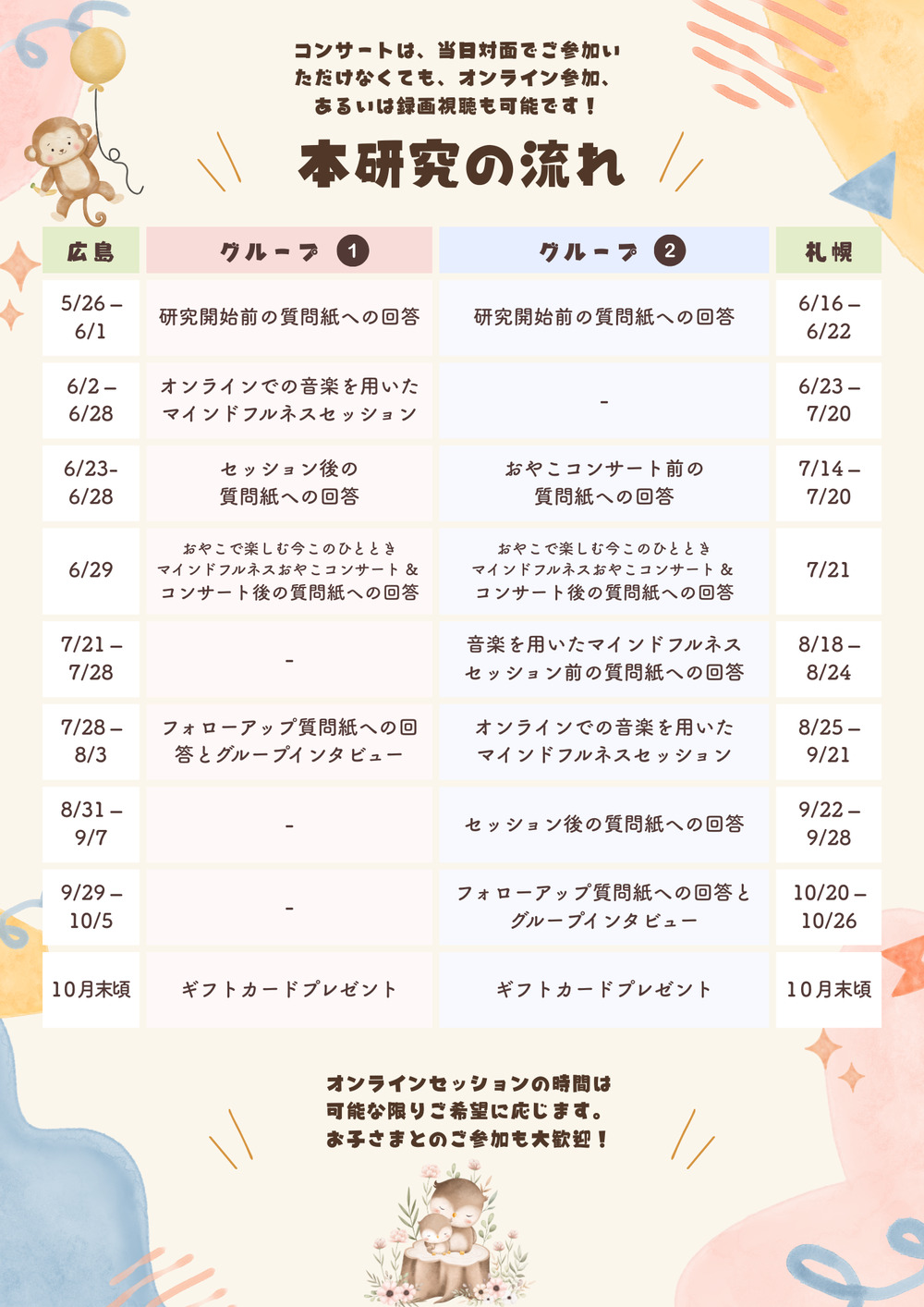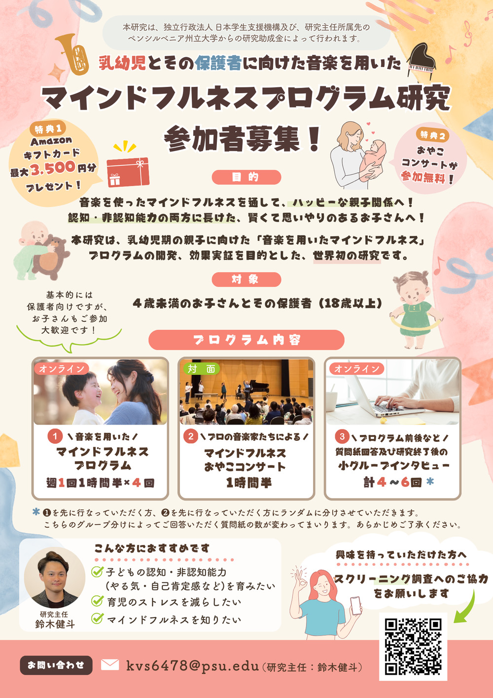 本研究は、乳幼児期の親子に向けた「音楽を用いたマインドフルネス」プログラムの開発、効果実証を目的とした、世界初の研究です。