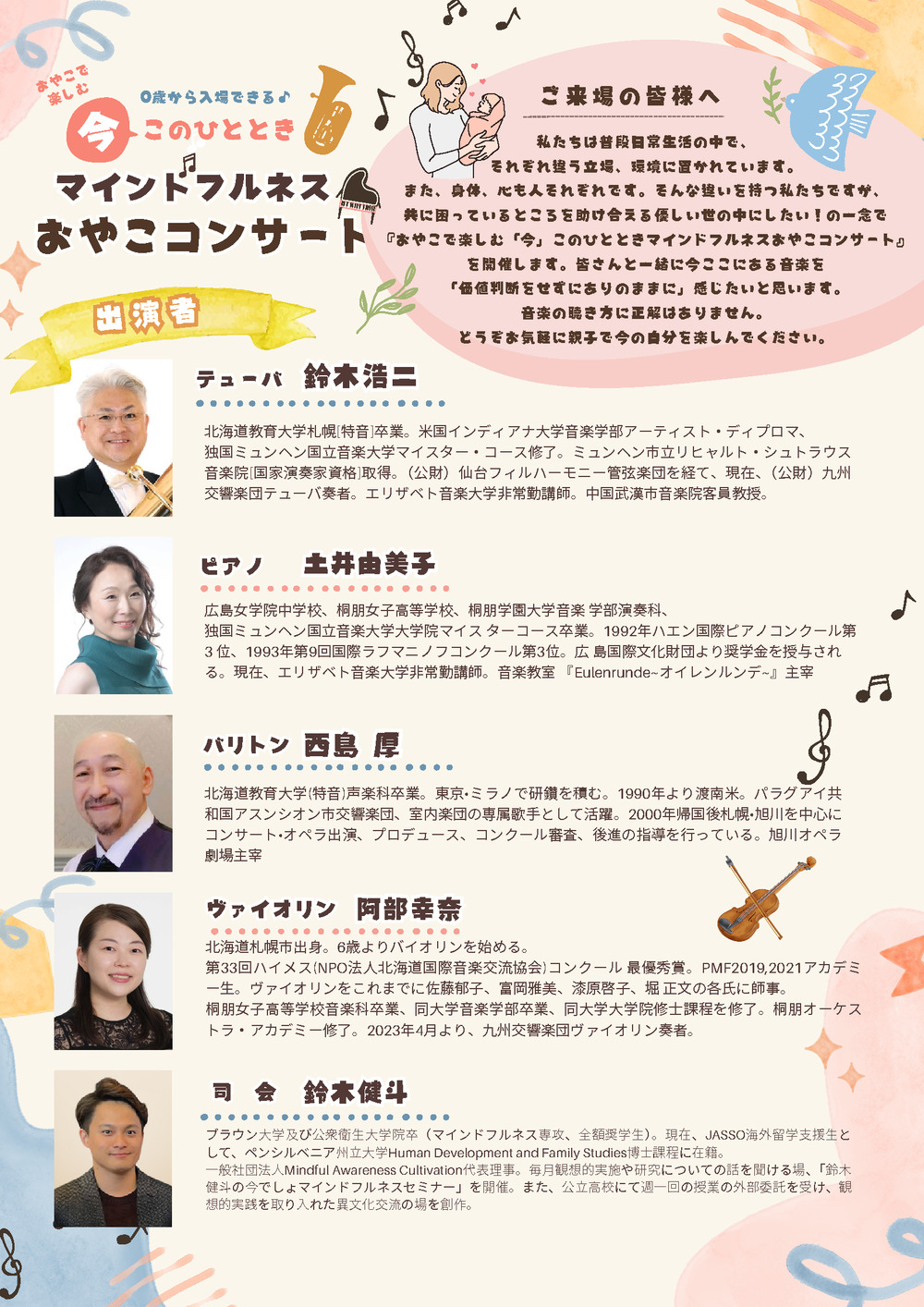 最新のマインドフルネス研究の成果も取り入れて、おやこで今このひとときをすごすこのひとときを、音楽と共に楽しんでみませんか?