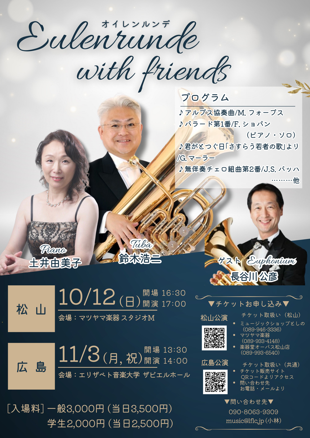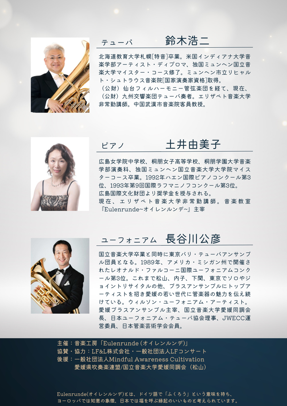 広島を中心に活動する、テューバ・ピアノデュオのオイレンルンデ、今回はユーフォニアムの長谷川公彦先生をお招きし、それぞれの楽器のソロ・デュオ・トリオでクラシック音楽の名曲からオリジナル曲まで、幅広い音楽を演奏します。歌心あふれる演奏は必見、どうぞお聴き逃しなく!
