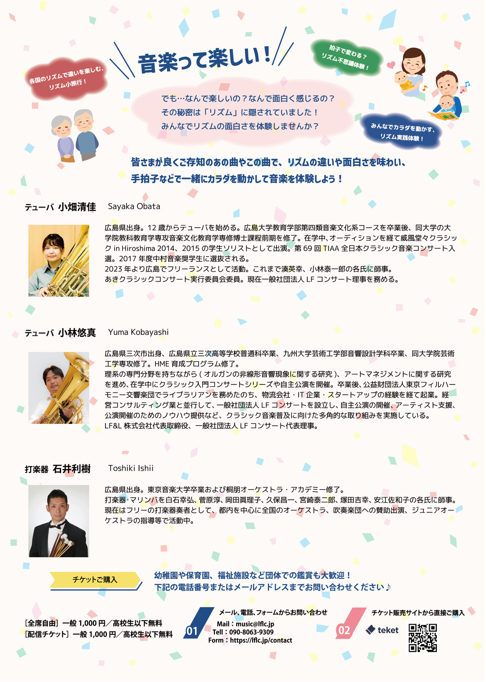そんなみなさまの声にお答えして企画しました本演奏会、平日昼間と夕方、0歳から入場可能、アクティビティを通して参加者全員で音楽の体験をしてみませんか?