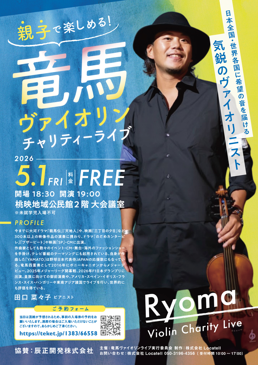 ヴァイオリニスト竜馬さんのオリジナル曲や、どこかで聴いたことのある耳馴染みのある楽曲を演奏していただきます。