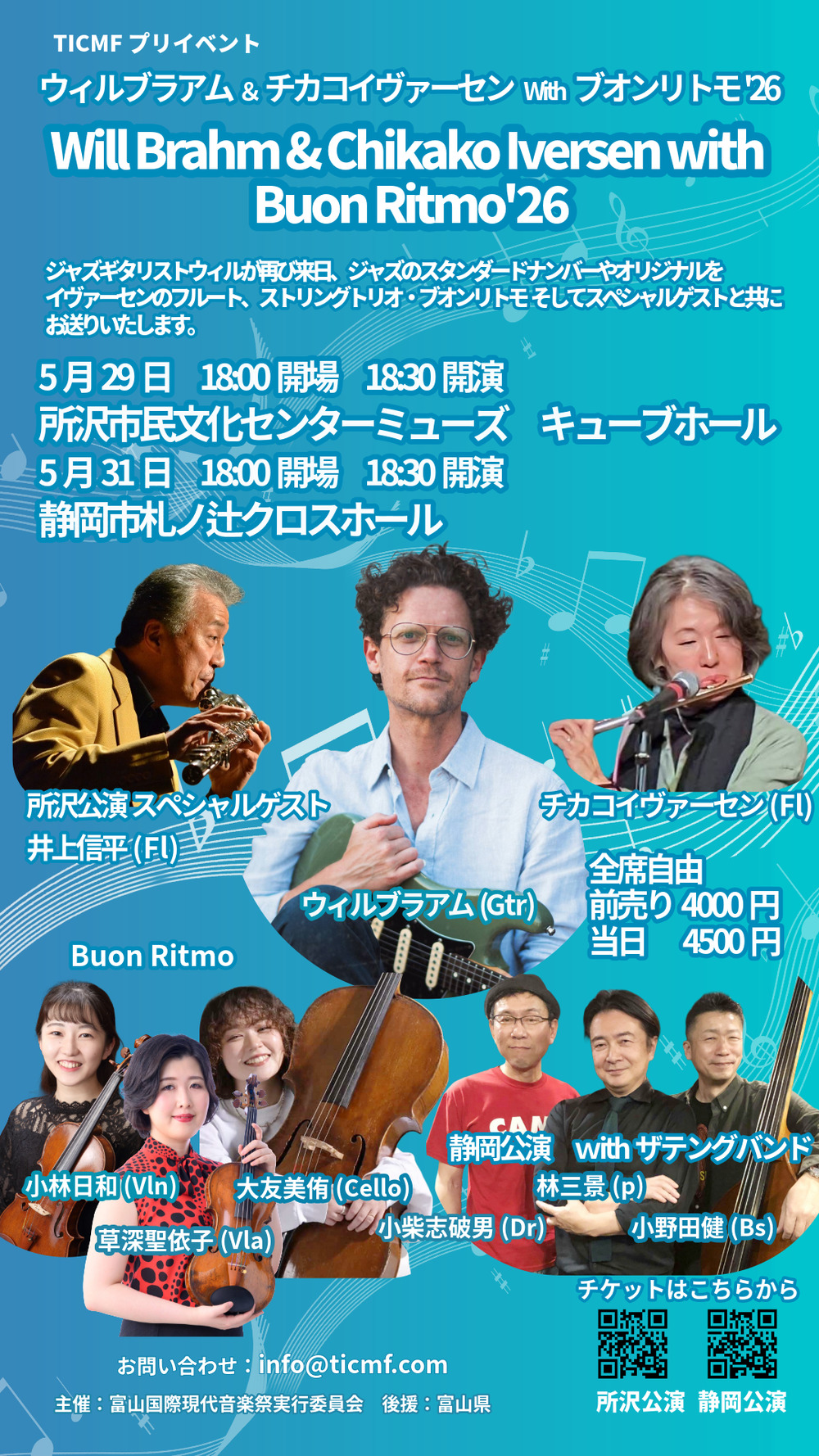 ジャズギターの名手ウィルブラアムが再来日、チカコイヴァーセン、ストリングストリオ”ブオンリトモ”とオリジナルやスタンダードを演奏。スペシャルゲストにジャズフルートの井上信平氏を招きジャズの魅力あふれるひと時をお送りいたします。