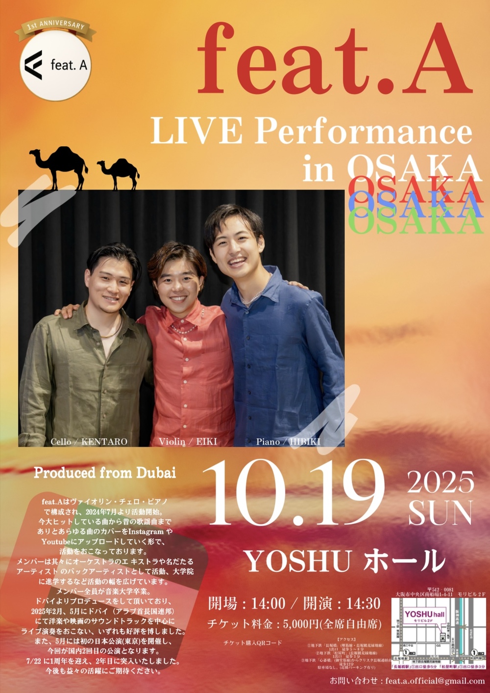 話題の邦楽から映画のサウンドトラック、洋楽まで幅広くピアノトリオにアレンジしてきたfeat.A が大阪で生演奏ライブをお届けします。