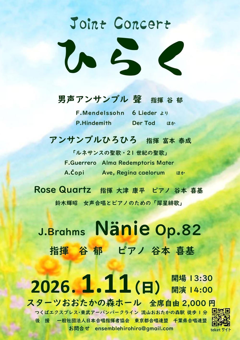 「広く寛く無伴奏アンサンブルを楽しみたい」と、音楽経験不問&年齢制限のない団として2023年春に創団。株式会社AcappelLabo代表の富本泰成先生を指揮者に迎え、春こん。や合唱祭出演のほか、YouTubeでの録音公開にも意欲的に挑戦。よくハモる純正調の理論を「ひろひろ」「せまひろ」などわかりやすい言葉でご指導いただき成長中。見学はいつでも大歓迎!