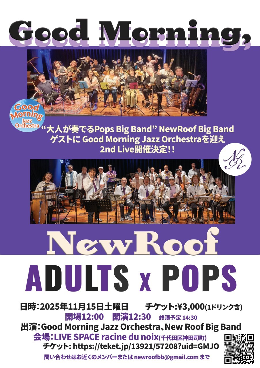 今回は"Good Morning, NewRoof 〜 ADULTS X POPS 〜"と称しまして、ゲストに Good Morning Jazz Orchestra さんを迎えての対バンライブです。
