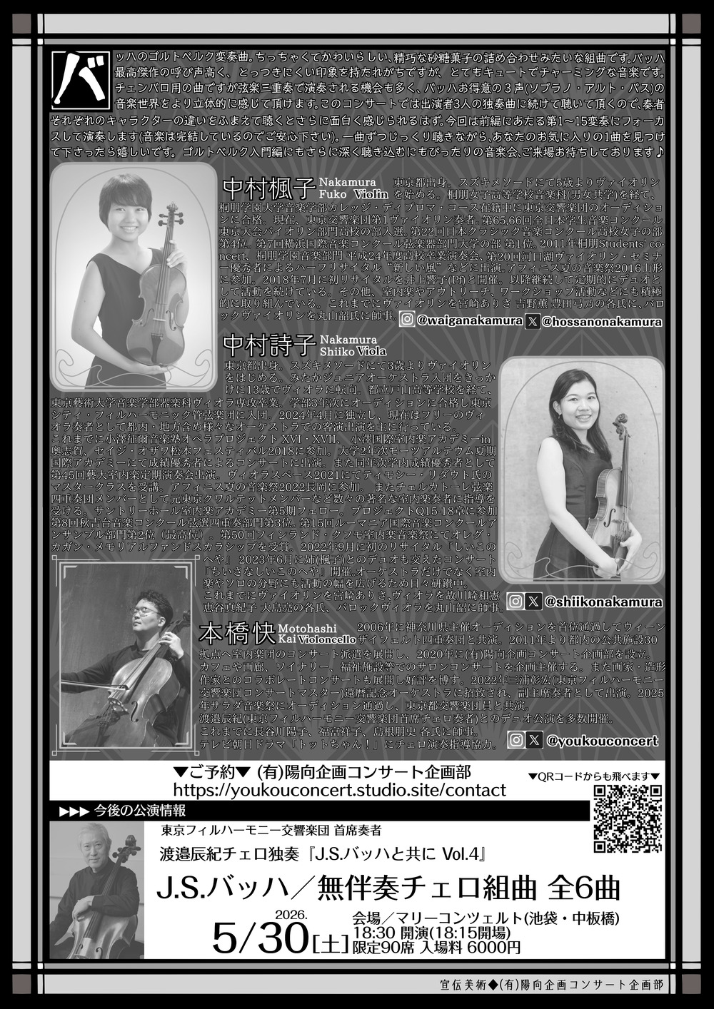 各奏者の独奏曲に続けて、バッハの最高傑作と呼び声も高い『ゴルトベルク変奏曲(弦楽三重奏版より)』を演奏致します。