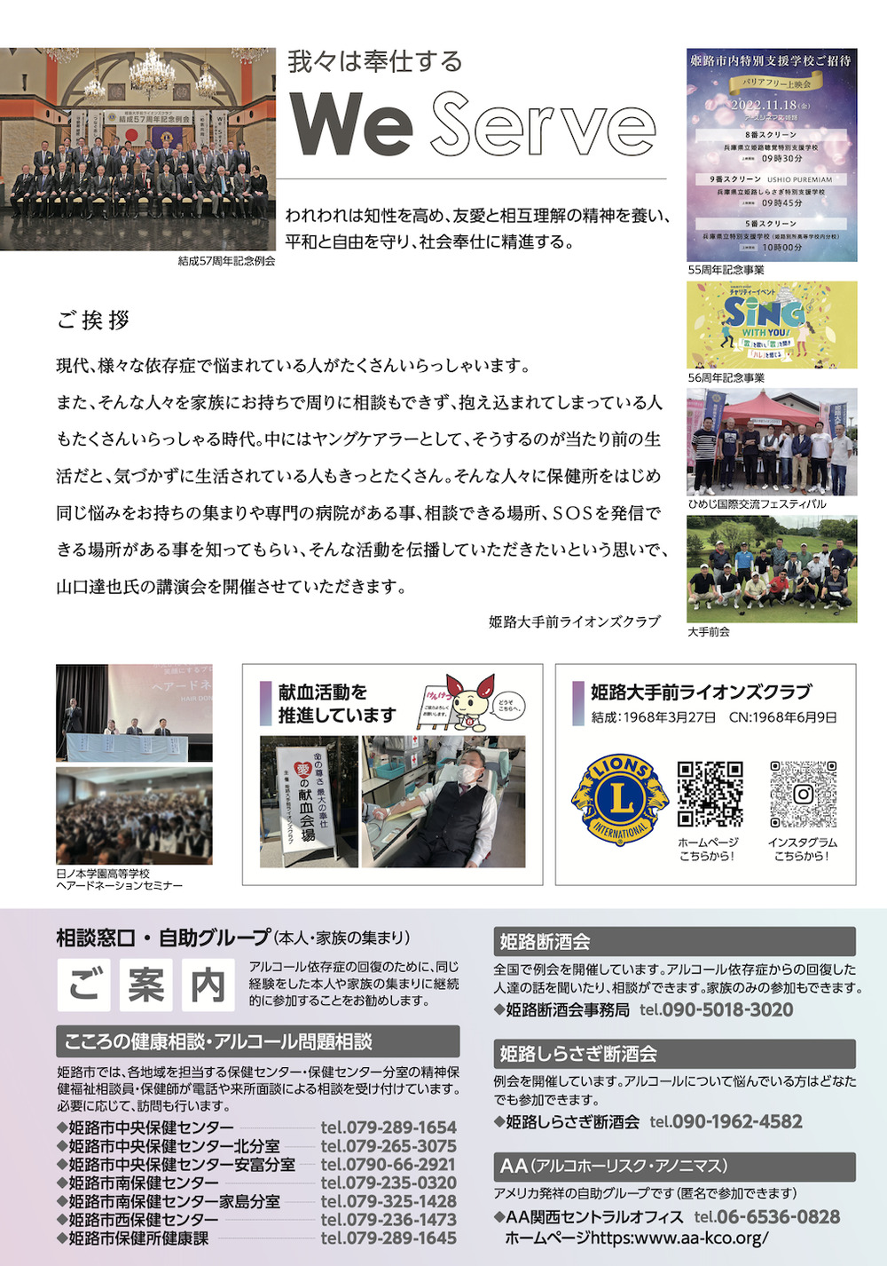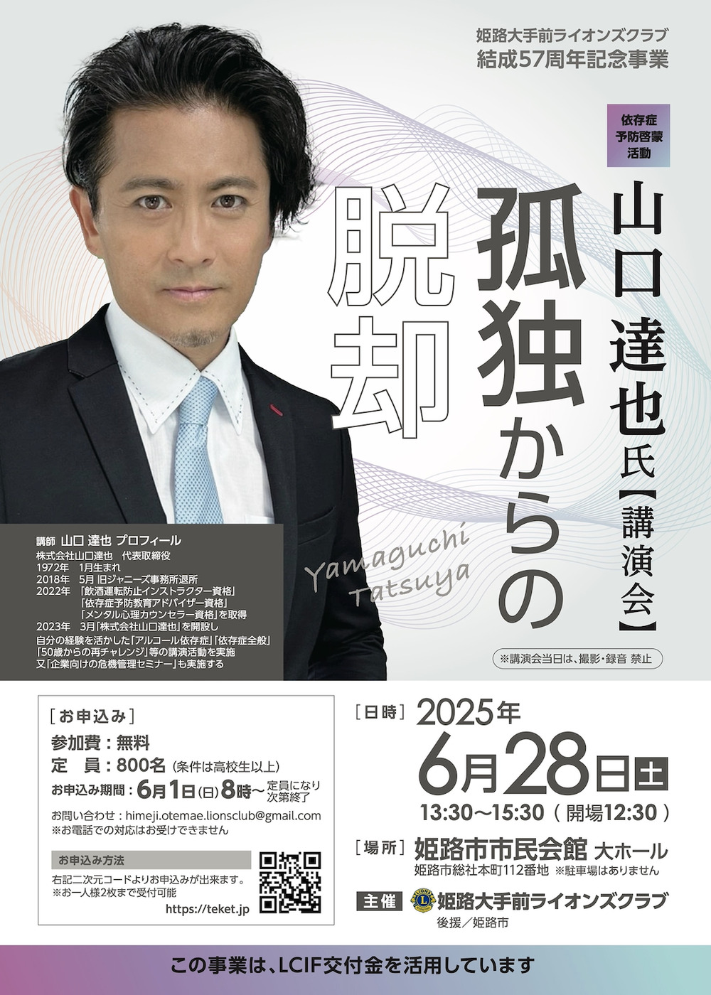 そんな人々に保健所をはじめ、同じ悩みをお持ちの集まりや専門の病院がある事、相談できる場所、SOSを発信できる場所がある事を知ってもらい、そんな活動を伝播していただきたいという思いで、山口達也氏の講演会を開催させていただきます。