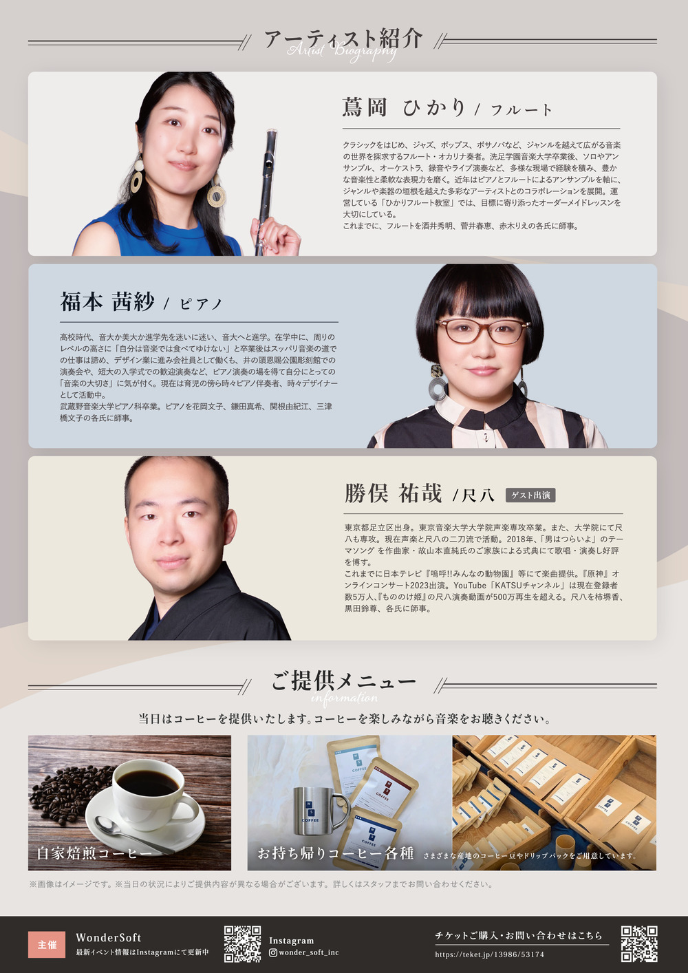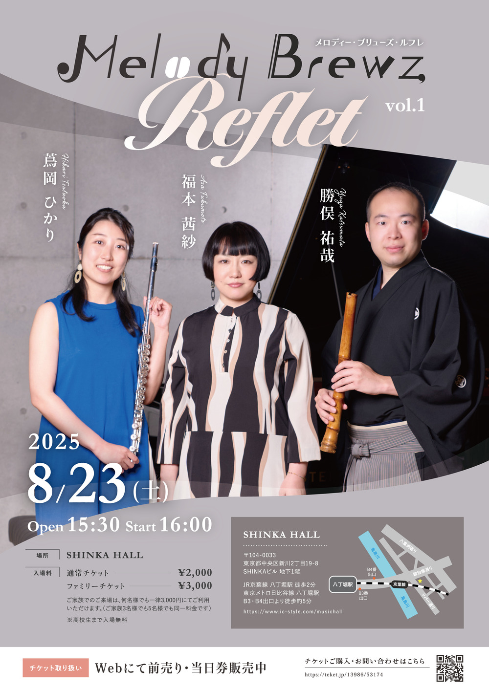 アニメやポップス、洋楽の名曲を、尺八・フルート・ピアノという少し珍しい編成で演奏します。