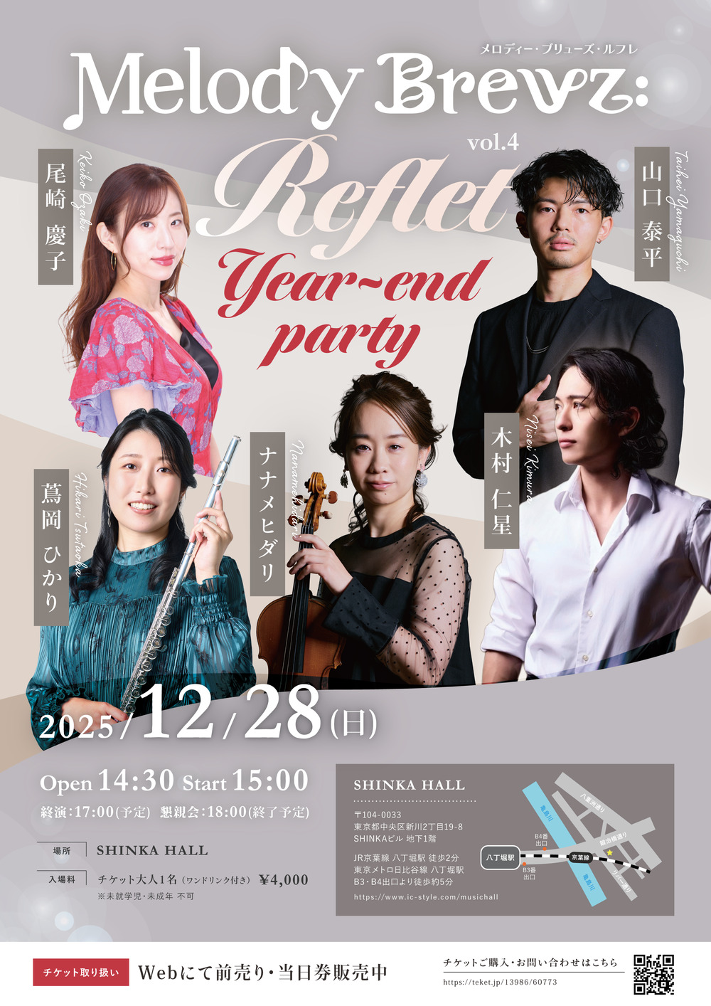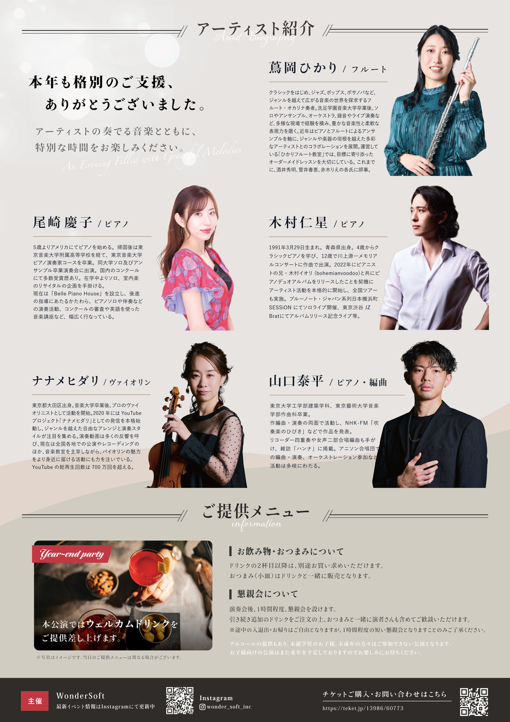 今回は、ピアニストの木村仁星さん、ピアニストの尾崎慶子さん、ヴァイオリニストのナナメヒダリさん、フルートの蔦岡ひかりさんを奏者にお迎えします。