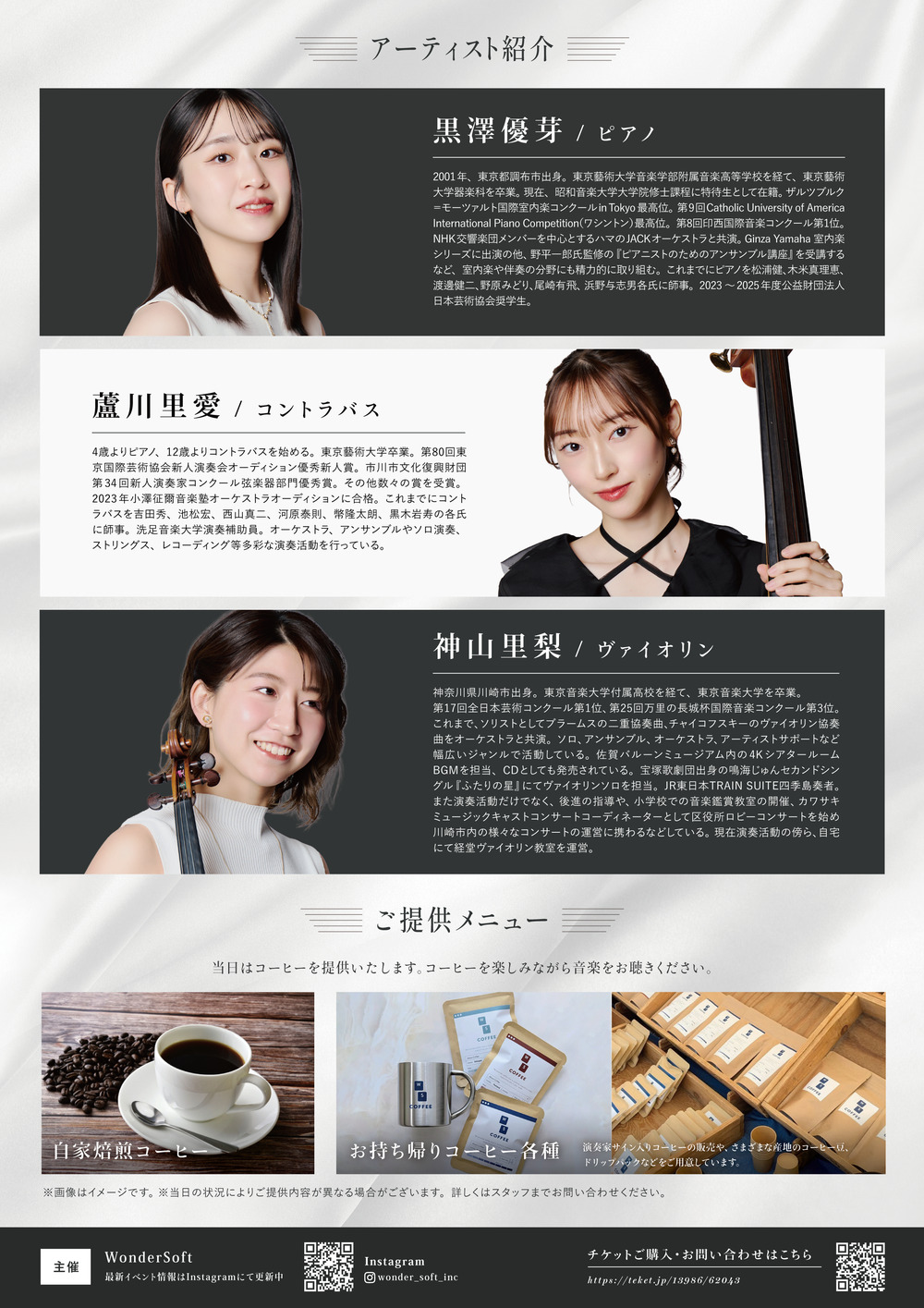 バイオリン・ピアノ・コントラバスというトリオ編成が織りなす優しい癒しの空間。