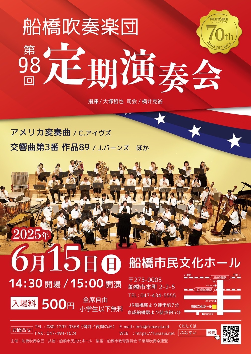 このたび、船橋吹奏楽団は創設70周年を迎え、第98回定期演奏会を開催いたします
