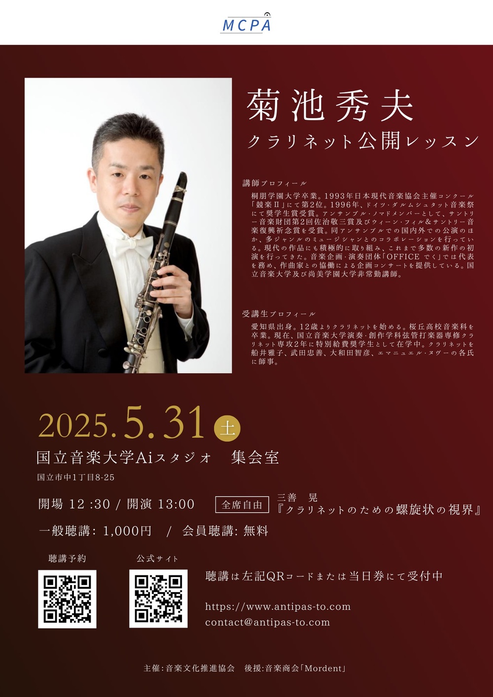 今回はクラリネット奏者でご活躍されている、菊池 秀夫先生をお招きし、菊池先生の得意とする現代音楽への切り口や、アプローチ、奏法等をレッスンしていただきます。