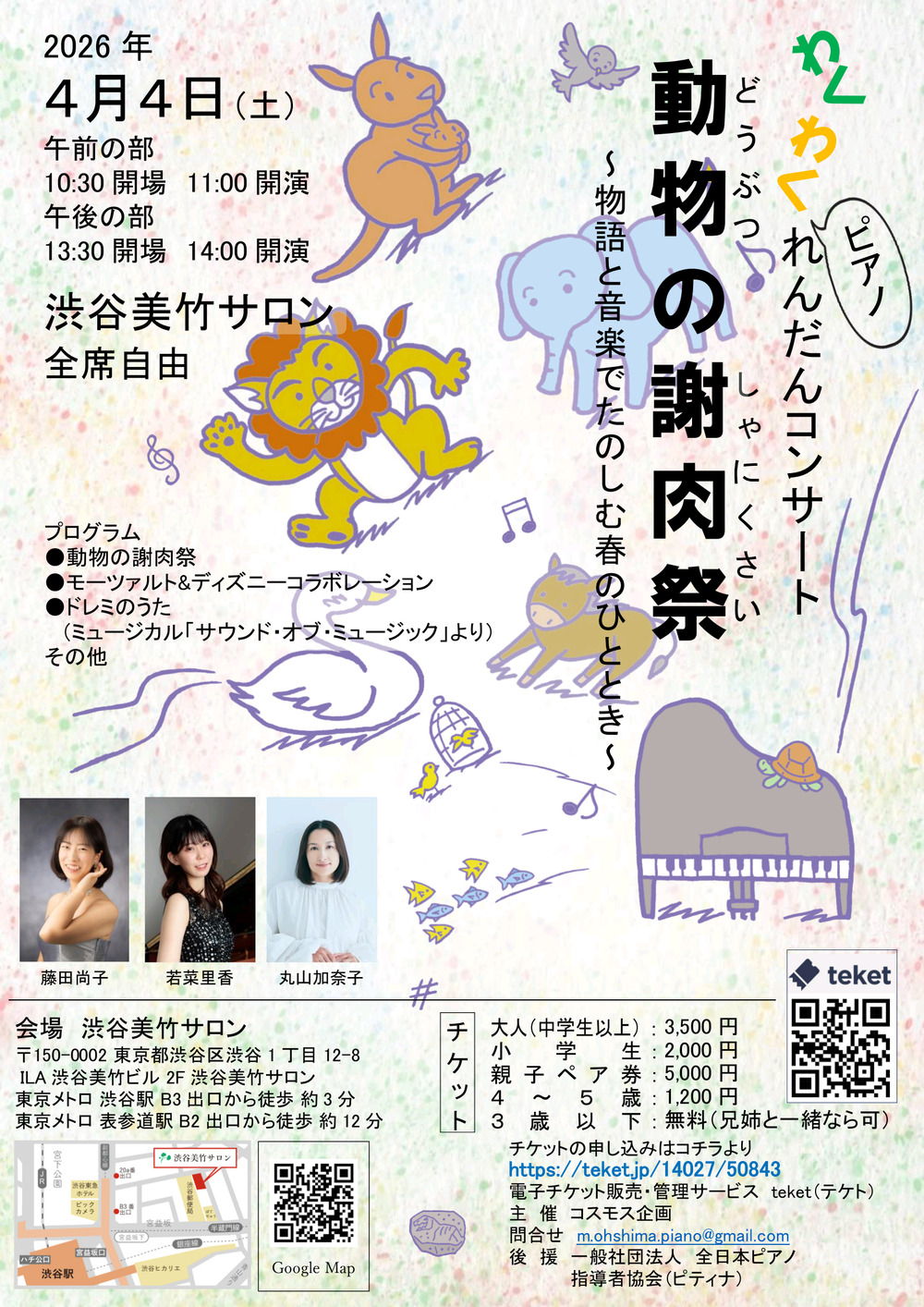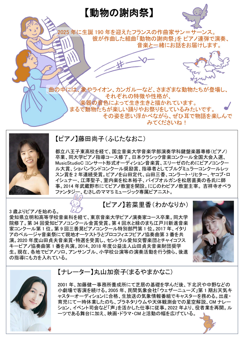 2025年に生誕190年を迎えたフランスの作曲家サン=サーンス。彼が作曲した組曲「動物の謝肉祭」を ピアノ連弾で演奏し、音楽と一緒にお話をお届けいたします。 最初にわかりやすい曲目紹介、そのあとは……さぁ、耳を澄まして、動物たちの会話が聞こえてきますよ……!