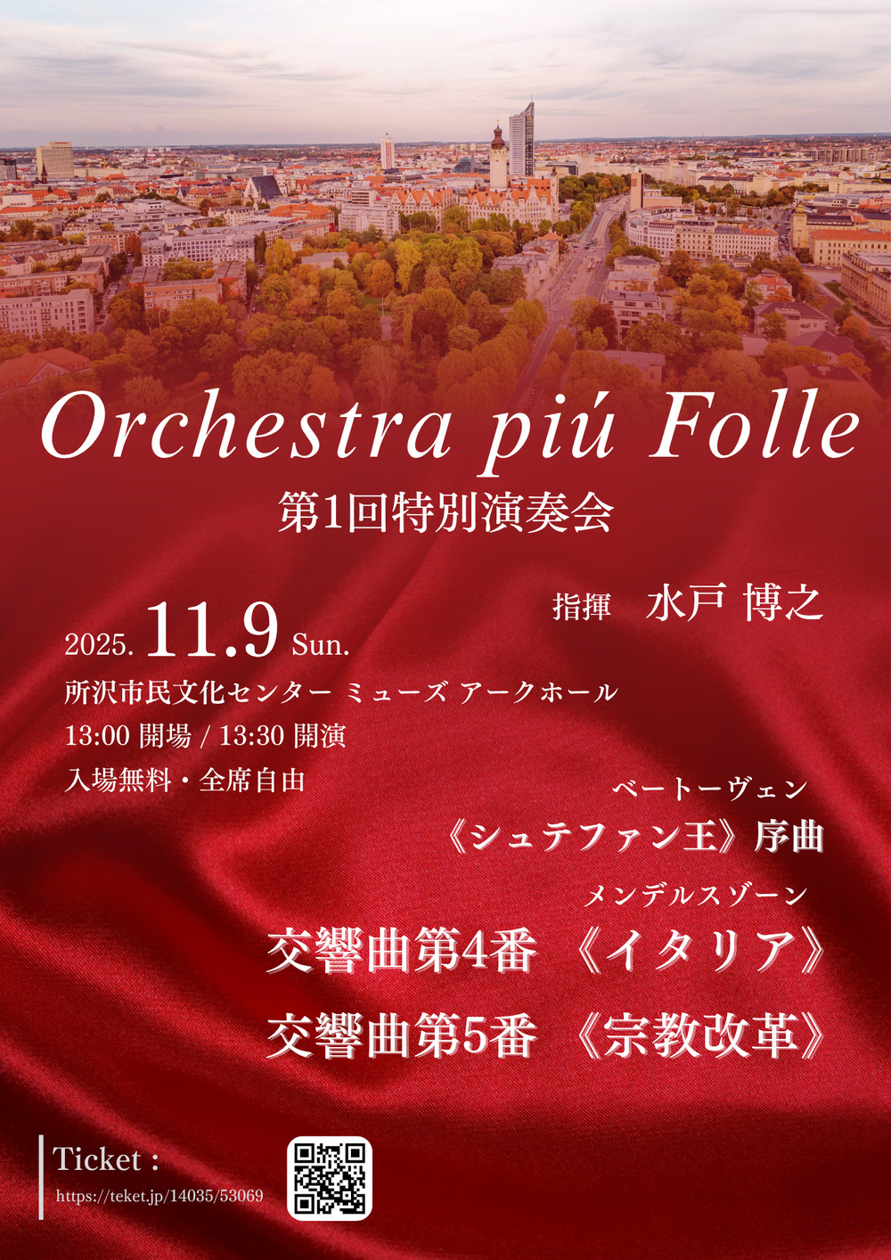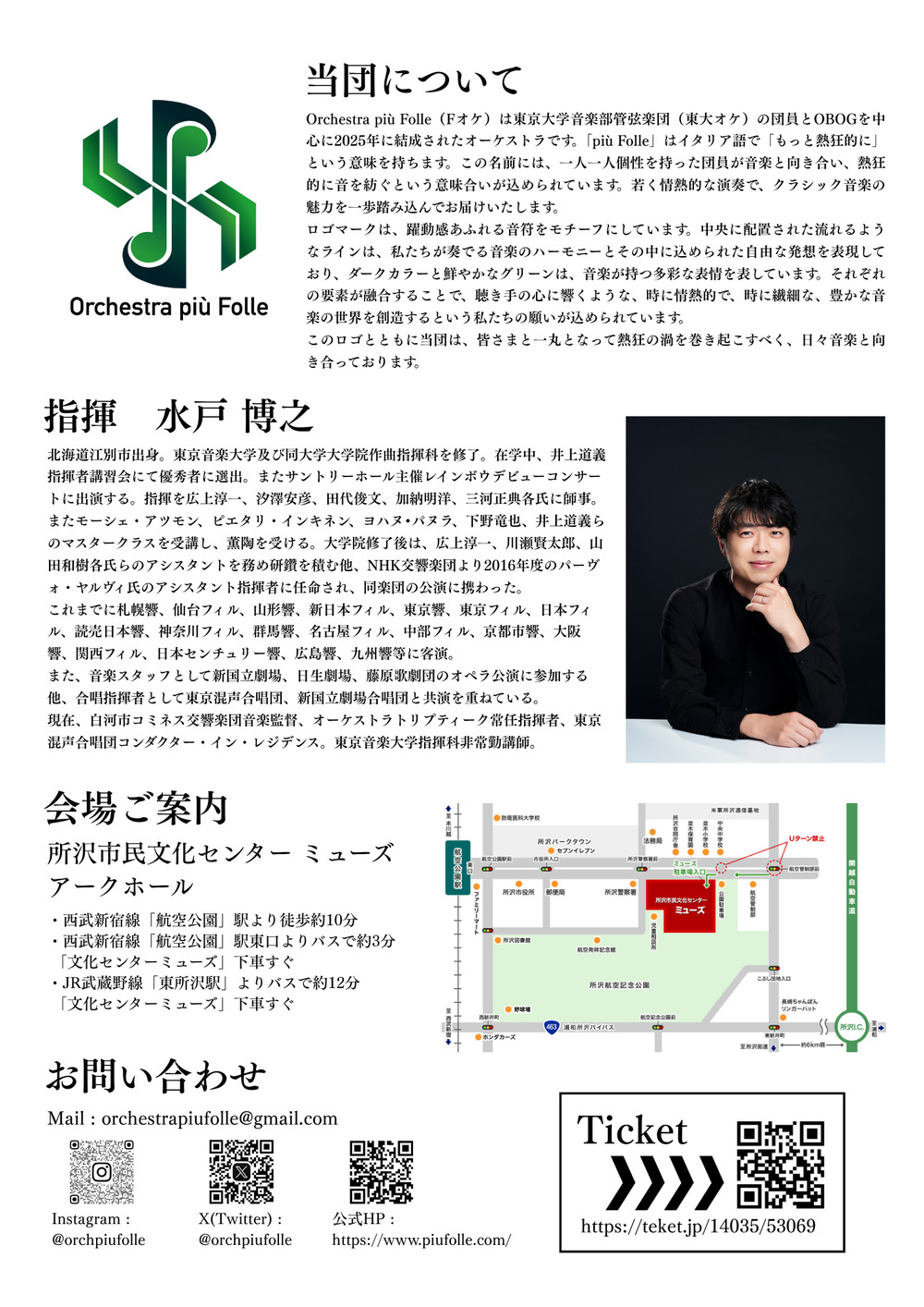 Orchestra più Folle(Fオケ)は東京大学音楽部管弦楽団(東大オケ)の団員とOBOGを中心に2025年に結成されたオーケストラです。「più Folle」はイタリア語で「もっと熱狂的に」という意味を持ちます。この名前には、一人一人個性を持った団員が音楽と向き合い、熱狂的に音を紡ぐという意味合いが込められています。若く情熱的な演奏で、クラシック音楽の魅力を一歩踏み込んでお届けいたします。