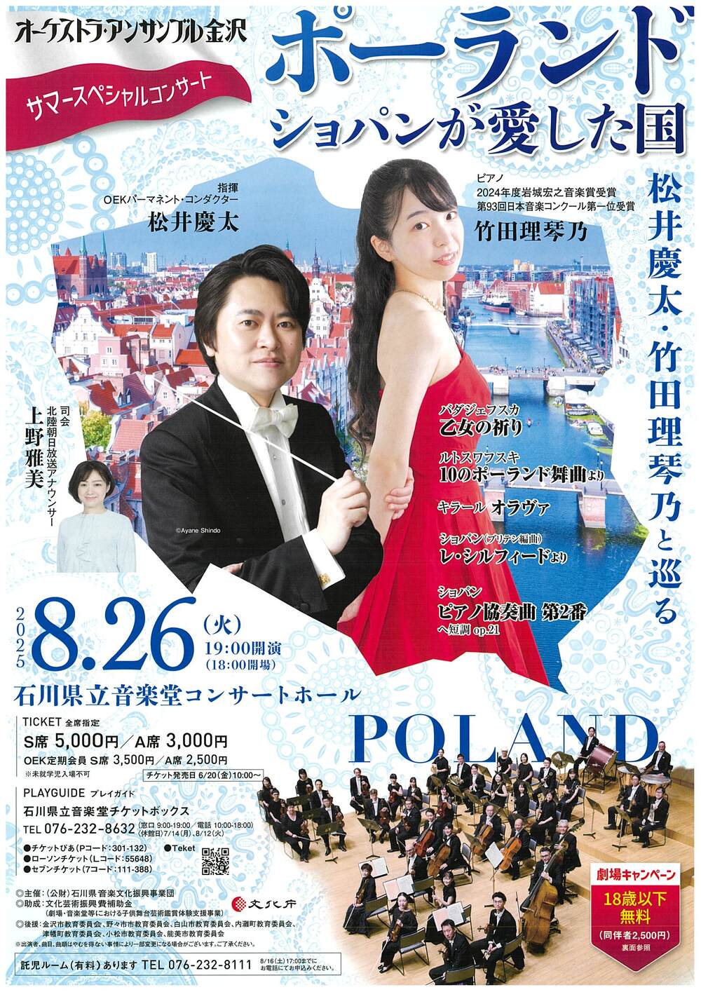 ポーランドと言えばこの人、ピアニスト竹田理琴乃が、万感の想いを込め、ショパン/ピアノコンチェルト第2番をお届けします。OEKパーマネントコンダクター松井慶太と、司会の北陸朝日放送アナウンサー上野雅美による楽しいトークの他、年ロビーで行われるコンダクターと楽団員によるお客様との歓談も楽しみのひとつ。今年はどんな企画があるのか、ご期待ください!