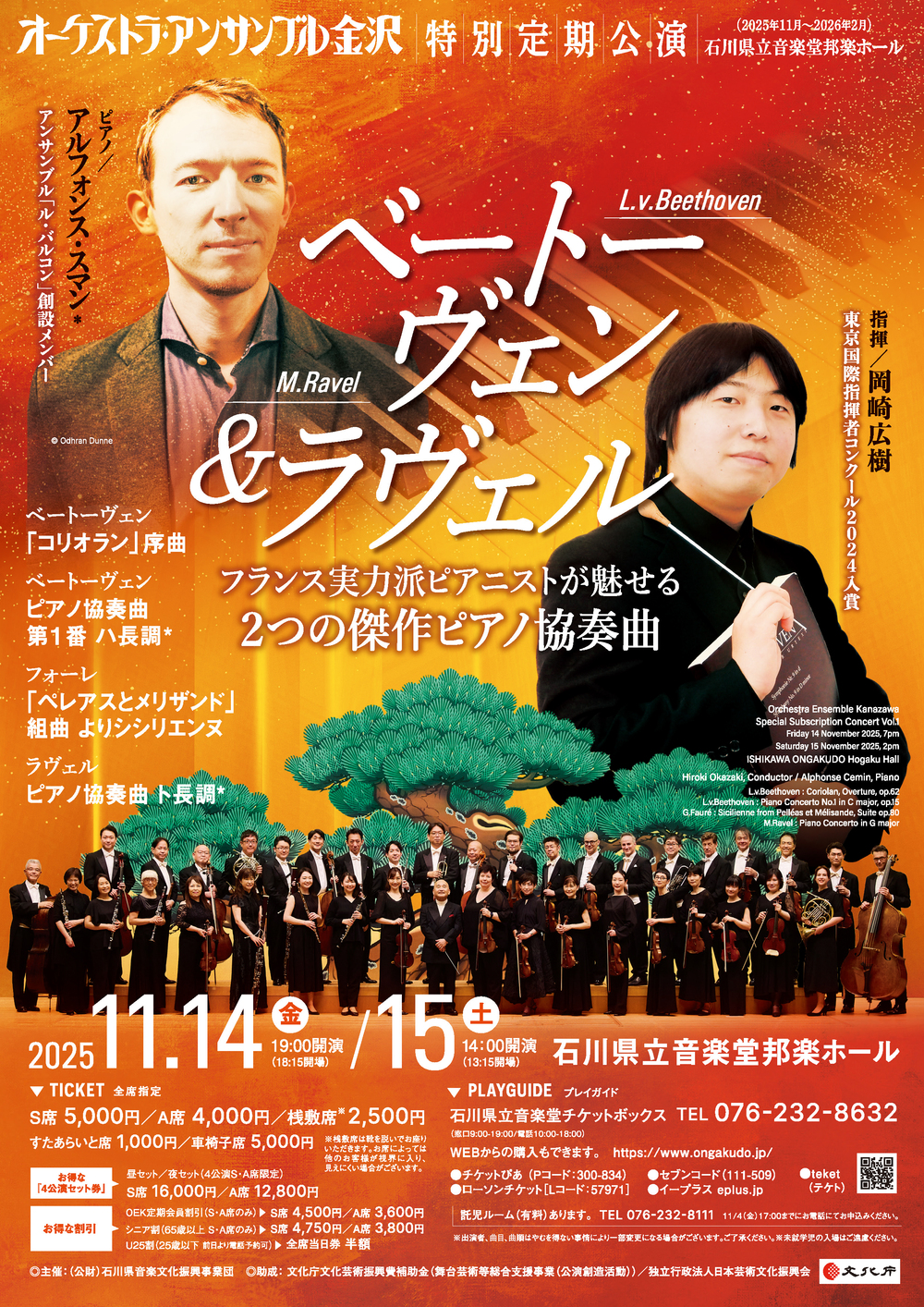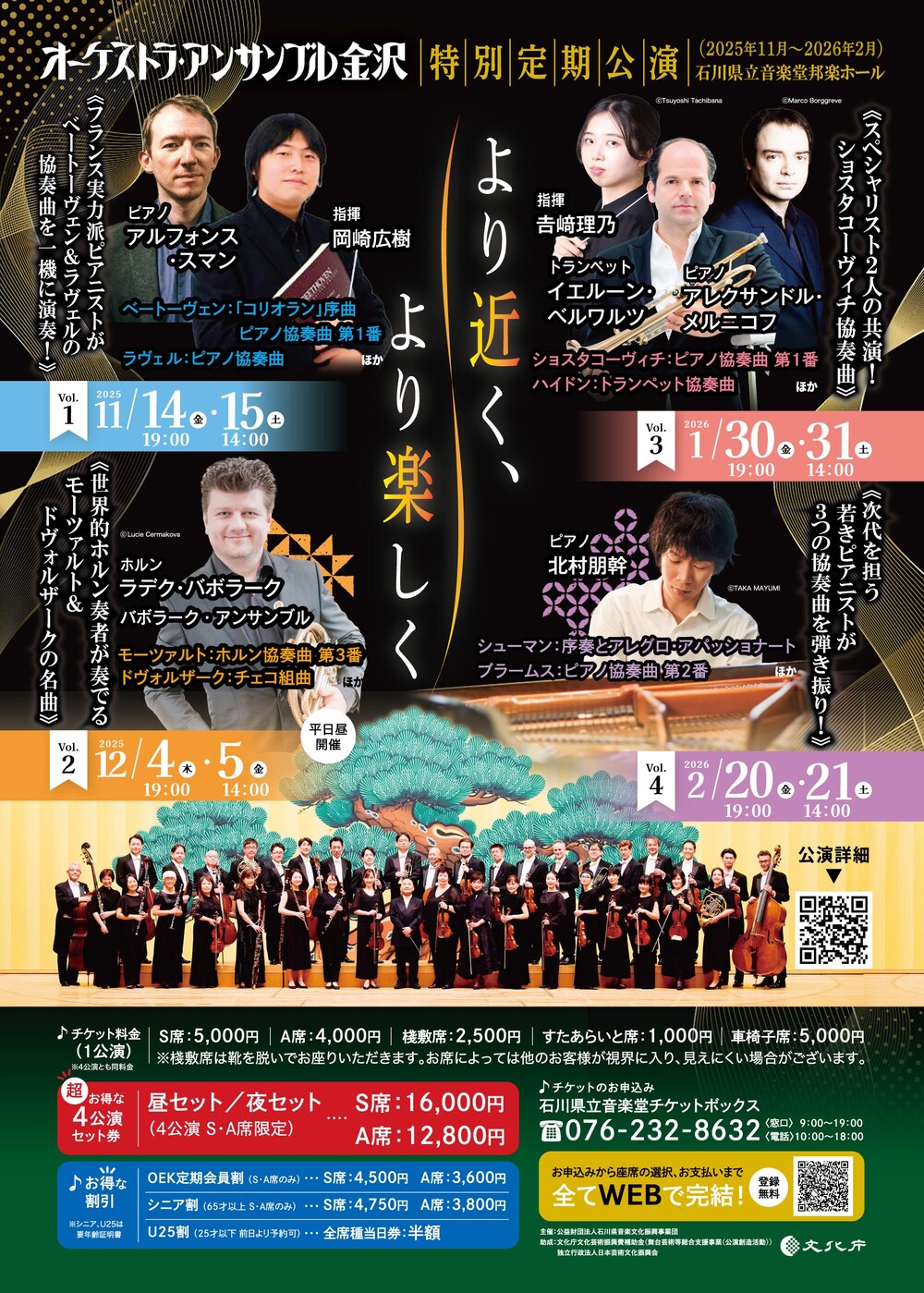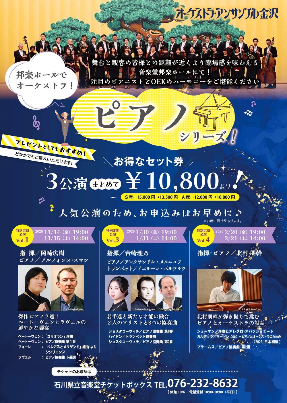 特別定期4公演セット券、ピアノセット券も好評発売中。セット券のお問い合わせは石川県立音楽堂チケットボックス076-232-8632まで。