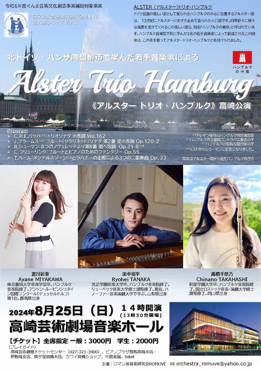 高崎芸術劇場音楽ホールの美しく、芳醇な響きの中、北ドイツでドイツ音楽の語法と音色をしっかり学んだ3名の若手音楽家によって、ドイツ音楽の真髄をお楽しみいただけると思います。