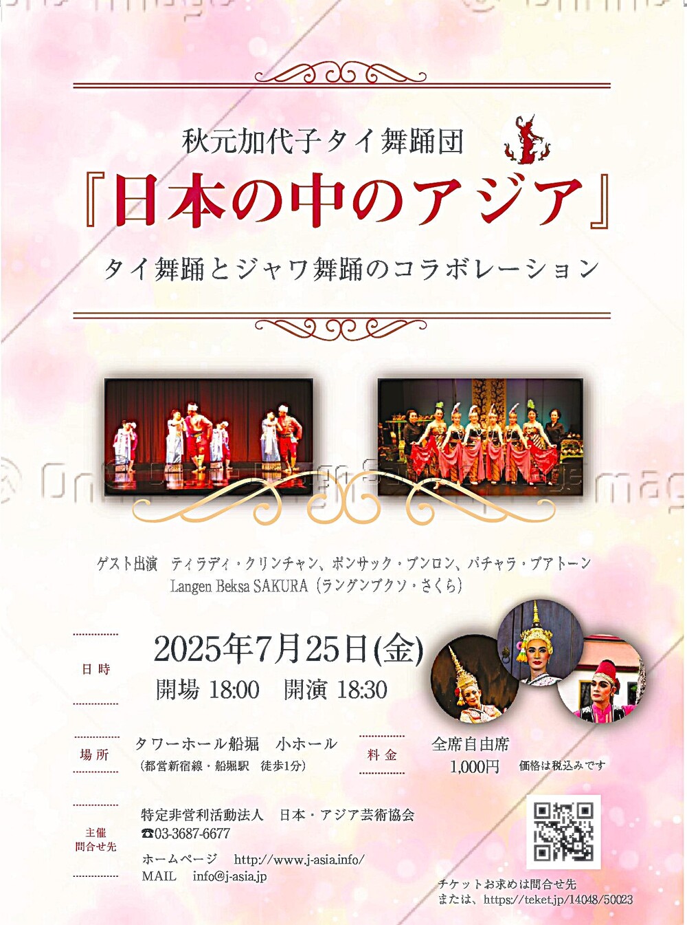 タイ本国のトップスターをはじめ、日本で活躍するジャワ舞踊家グループ「ラングンブクソさくら」をゲストに迎え、歴史的に影響しあってきたタイ~インドネシアの芸術文化を感じるバラエティーに富んだプログラムです。