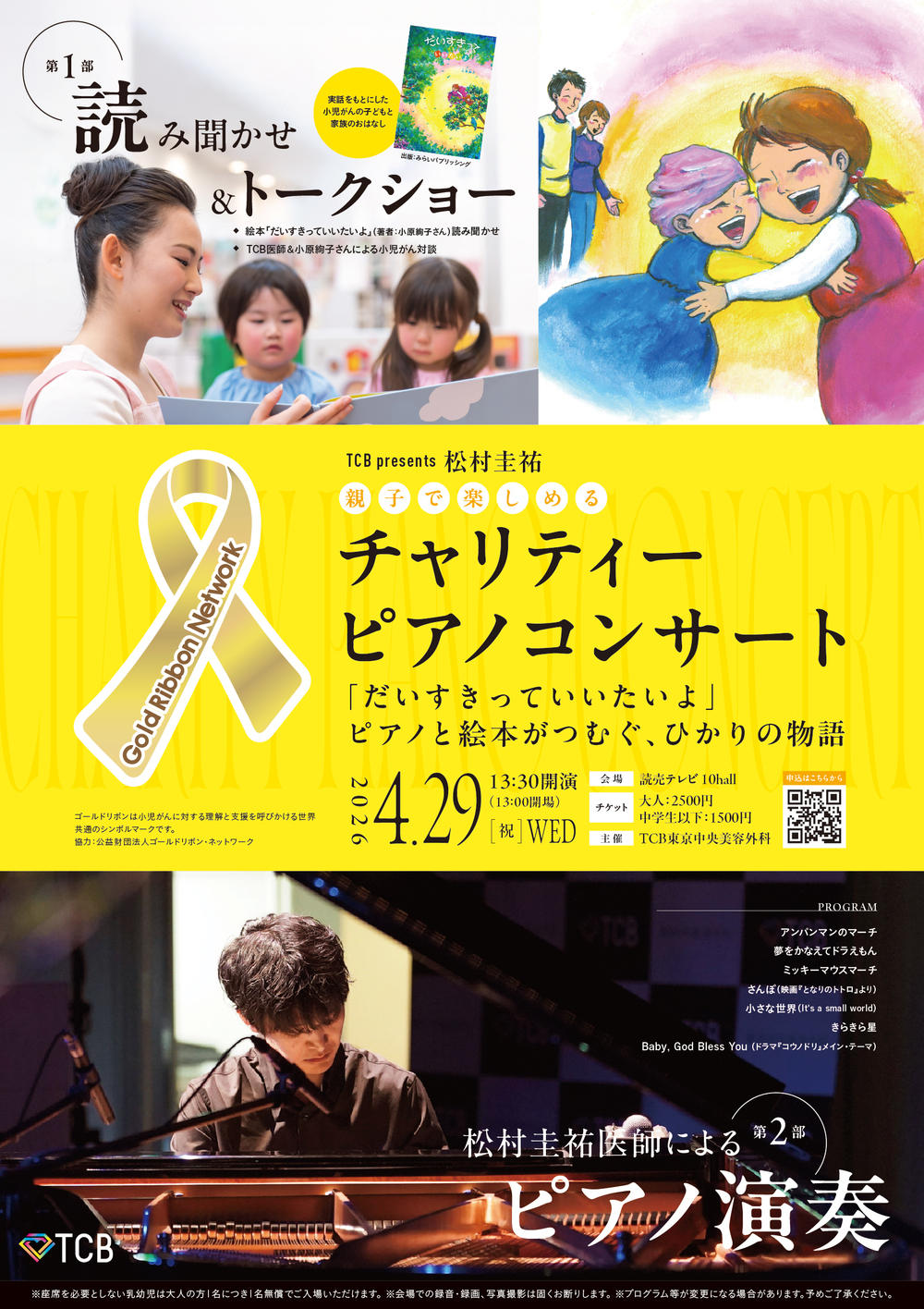 なお、チケット収益は小児がん支援活動「ゴールドリボン」の趣旨に沿った団体への寄付を予定しております。