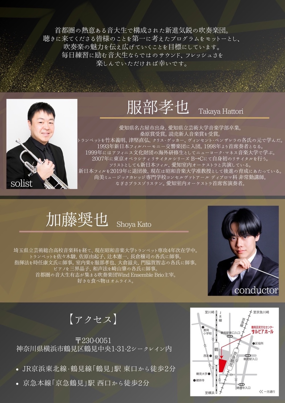 今回の演奏会では、元新日本フィル首席トランペット奏者の服部孝也氏を招き、アグレッシヴな協奏曲と吹奏楽の名曲をたっぷりお届けいたします。