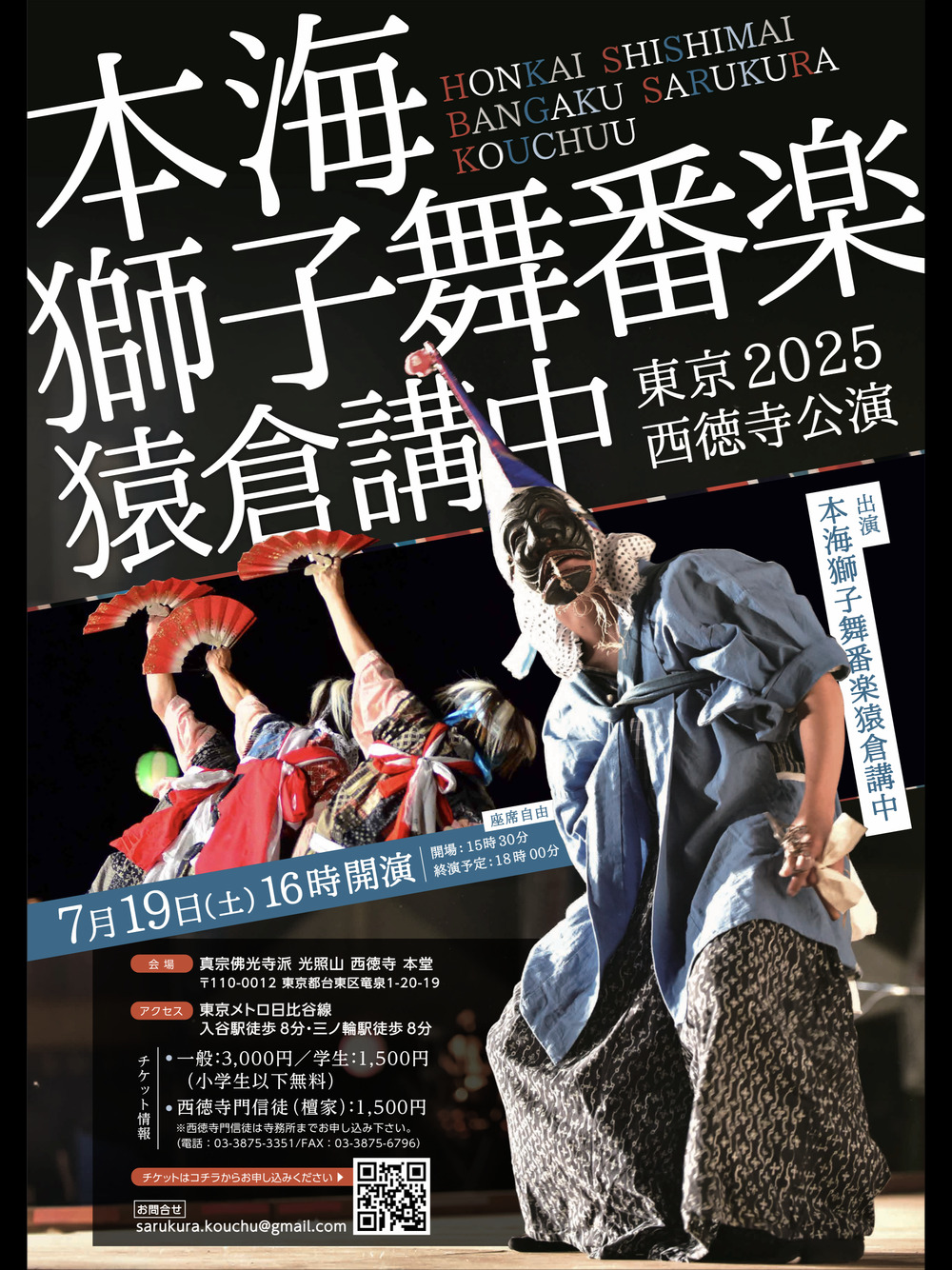 このたび、芸能に縁の深い西徳寺の本堂で本海獅子舞番楽猿倉講中の公演を行うことになりました。