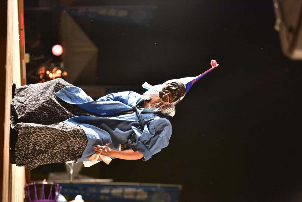 神楽の場に登場し、滑稽な言い立てを語り、足を跳ね上げる軽快な舞で大地を踏み固め、舞台を祓い清めます。