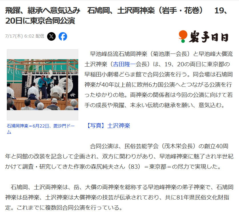 飛躍、継承へ意気込み 石鳩岡、土沢両神楽(岩手・花巻) 19、20日に東京合同公演(岩手日日様)
