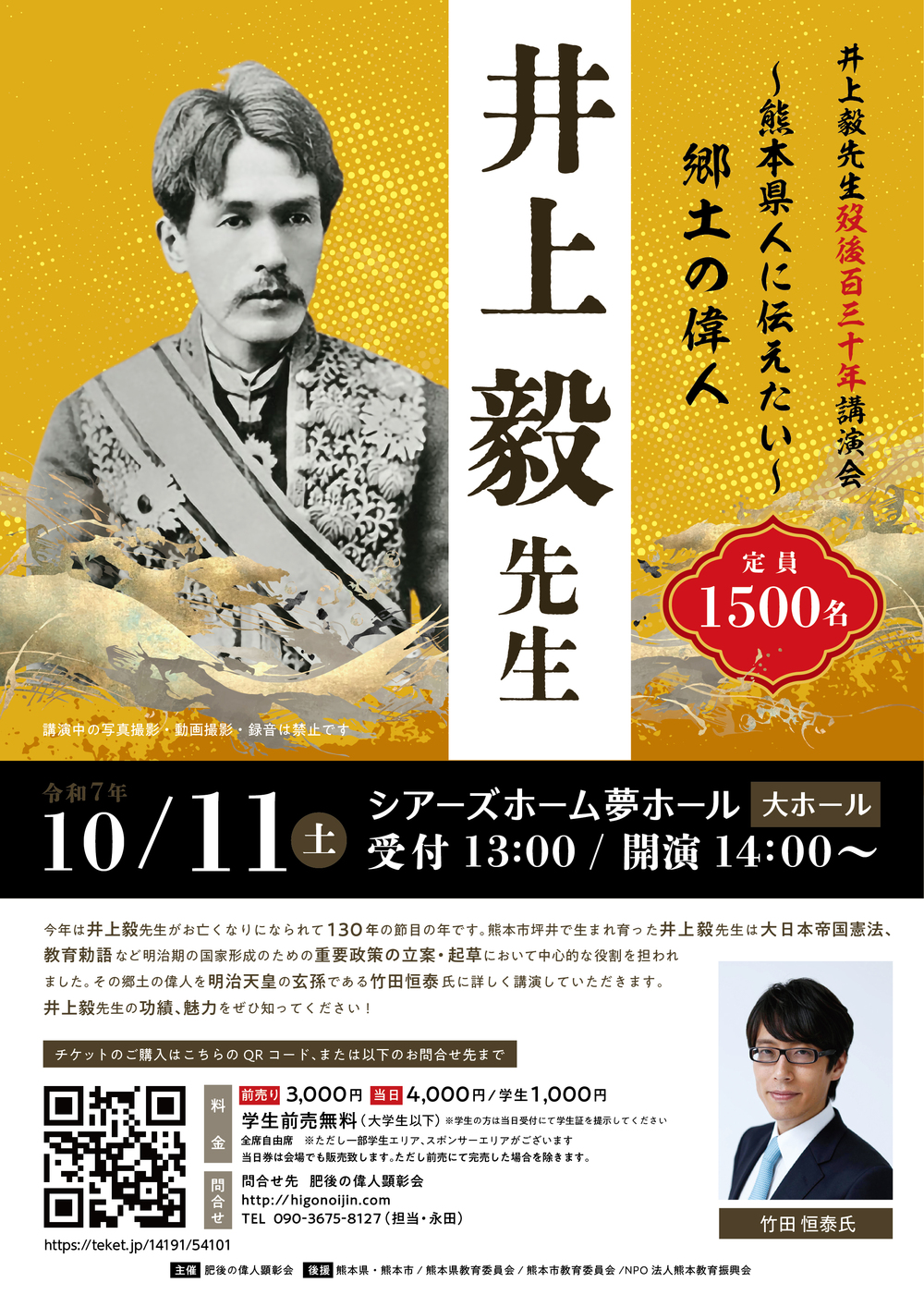 今年は井上毅先生がお亡くなりになられて130年の節目の年です。熊本市坪井で生まれ育った井上毅先生は大日本帝国憲法、教育勅語など明治期の国家形成のための重要政策の立案・起草において中心的な役割を担われました。その郷土の偉人を明治天皇の玄孫である竹田恒泰氏に詳しく講演していただきます。井上毅先生の功績、魅力をぜひ知ってください!