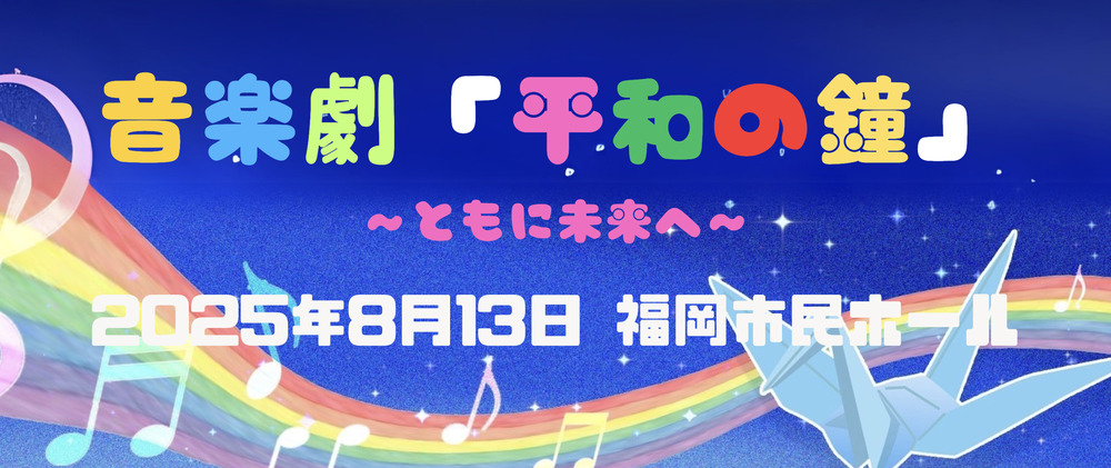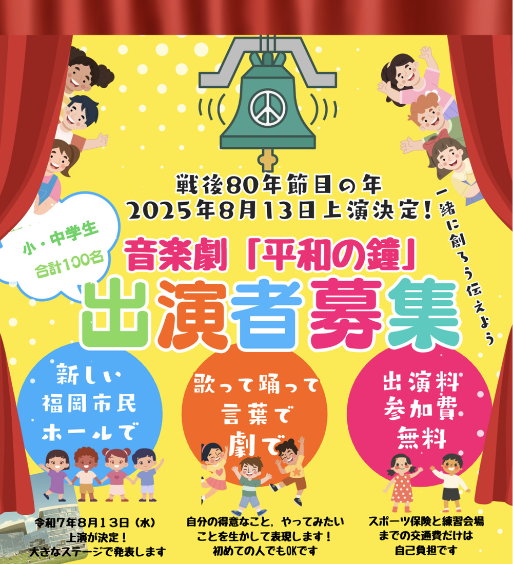 音楽劇『平和の鐘』は、戦後80年の節目に、福岡の小中学生によって公募形式で上演される舞台です。脚本・演出は福岡市内の現役教員によるもので、20年前から福岡の小学校で大切に演じ継がれてきた作品が、このたび戦後80年バージョンとして新たに生まれ変わります。