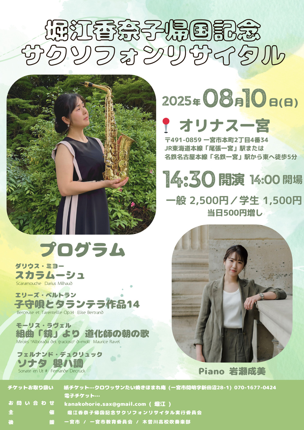 フランス留学から帰国した一宮市出身のサクソフォニスト堀江香奈子による帰国記念演奏会。