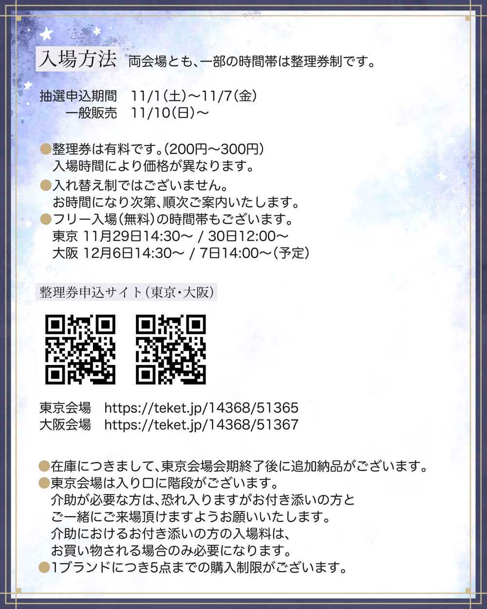 ・入場開始15分前〜5分前にお集まりください。入場順は5分前までにお集まり頂いた方の中でランダムになります。(それ以降は到着順)