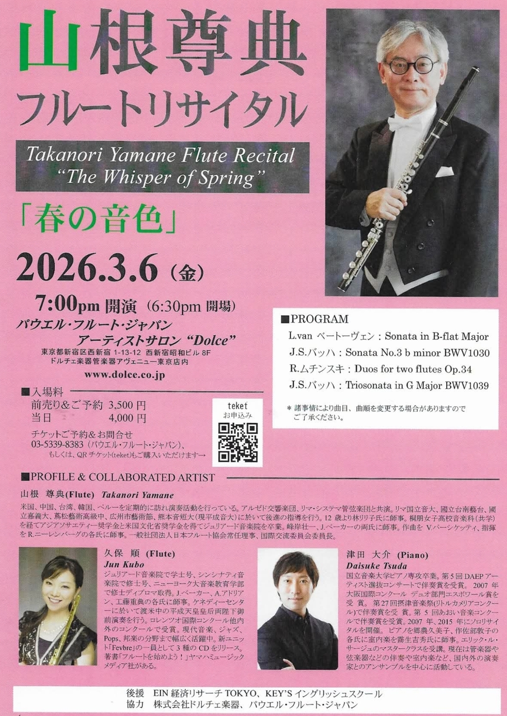シーズンに2度開催される山根尊典フルートリサイタルフライデーイブニングシーズンat Dolce、今回はフルーティスト久保順さんピアニスト津田大介さんの共演で多彩なプログラムで春の訪れを楽しんでいただきます。