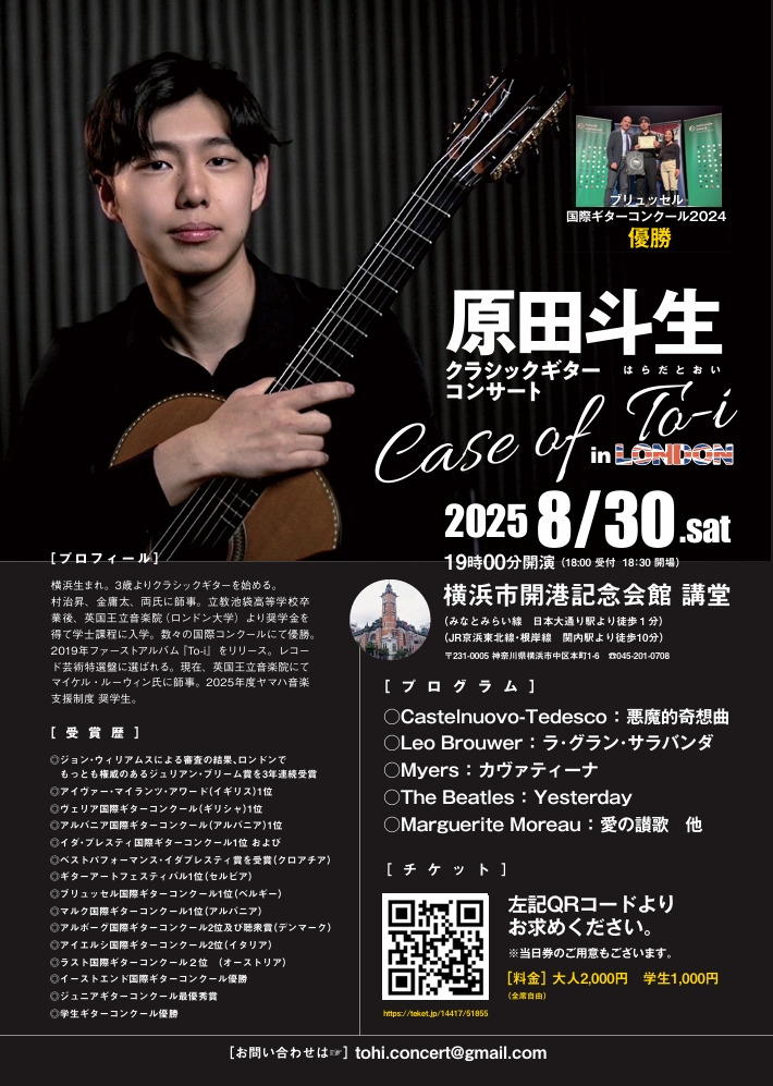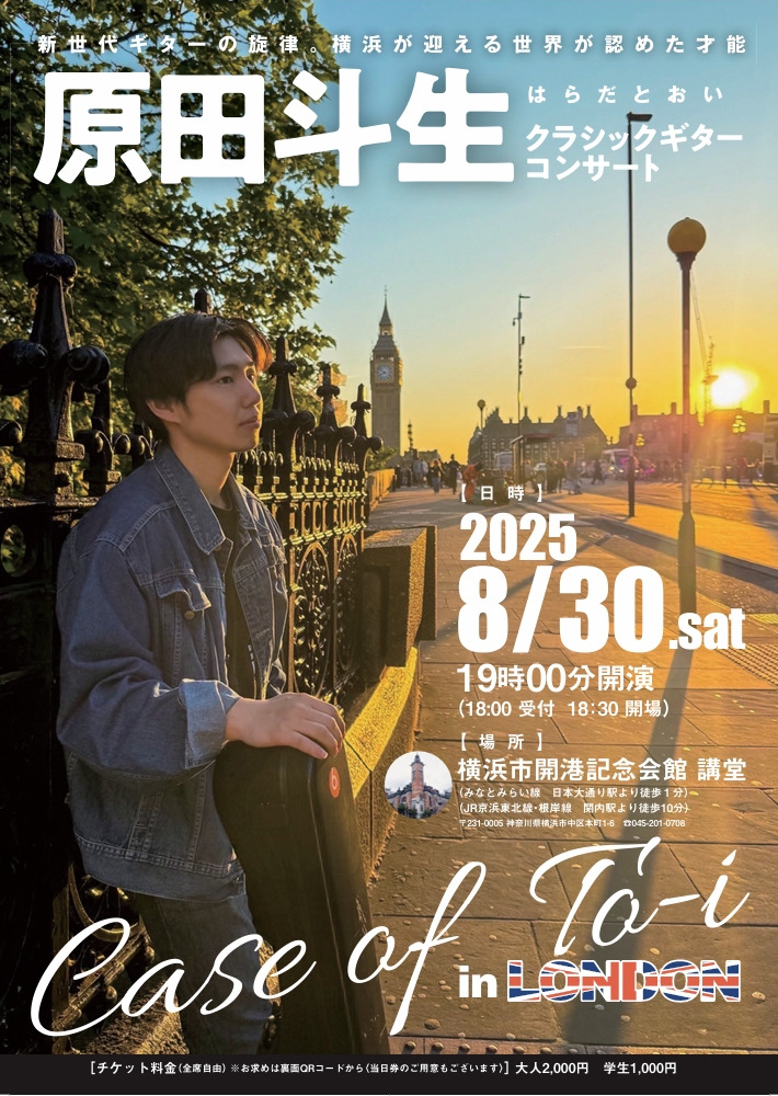 「クラシックギタリスト原田斗生」を知っていただく方々に向けて、特別なプログラムをお届けします。ギターの難曲から親しみやすい名曲、英国ゆかりの作品、さらには亡き友人への想いを込めて自ら作曲した作品まで、今の〝斗生(To-i)”だからこそ奏でられる音を生演奏でお楽しみいただければ幸いです。皆様にとって心に残る特別な夜となりますように。