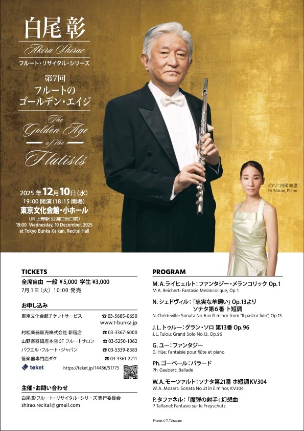 2019年に始めた私のリサイタルシリーズも、途中コロナで中止、延期ということもありながら第7回を迎えることができました。今回はM.モイーズが編纂した曲集、「The Golden Age of the Flutists」から3曲を演奏したいと思います。モイーズが愛したこれらの19世紀の作品は、当時のフルートの名人達が作曲したもので、どの曲もフルートという楽器の特性を存分に生かしたものばかりです。他の時代のゴールデン・エイジであるバロックや古典、それに近代フルートの作品も演奏いたします。お楽しみいただければ幸いです。