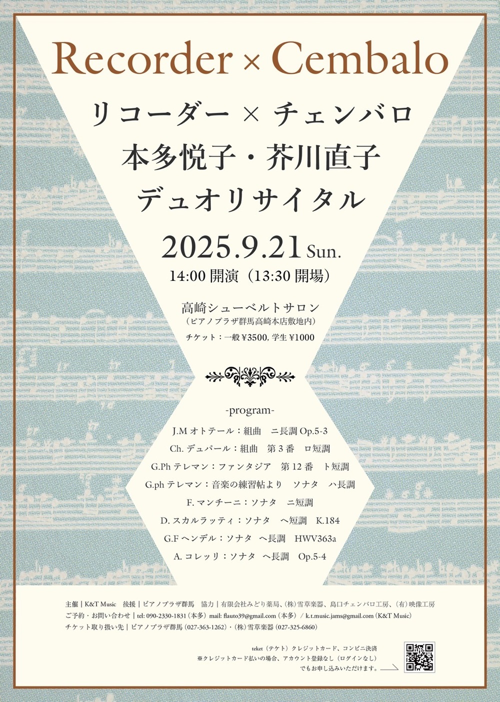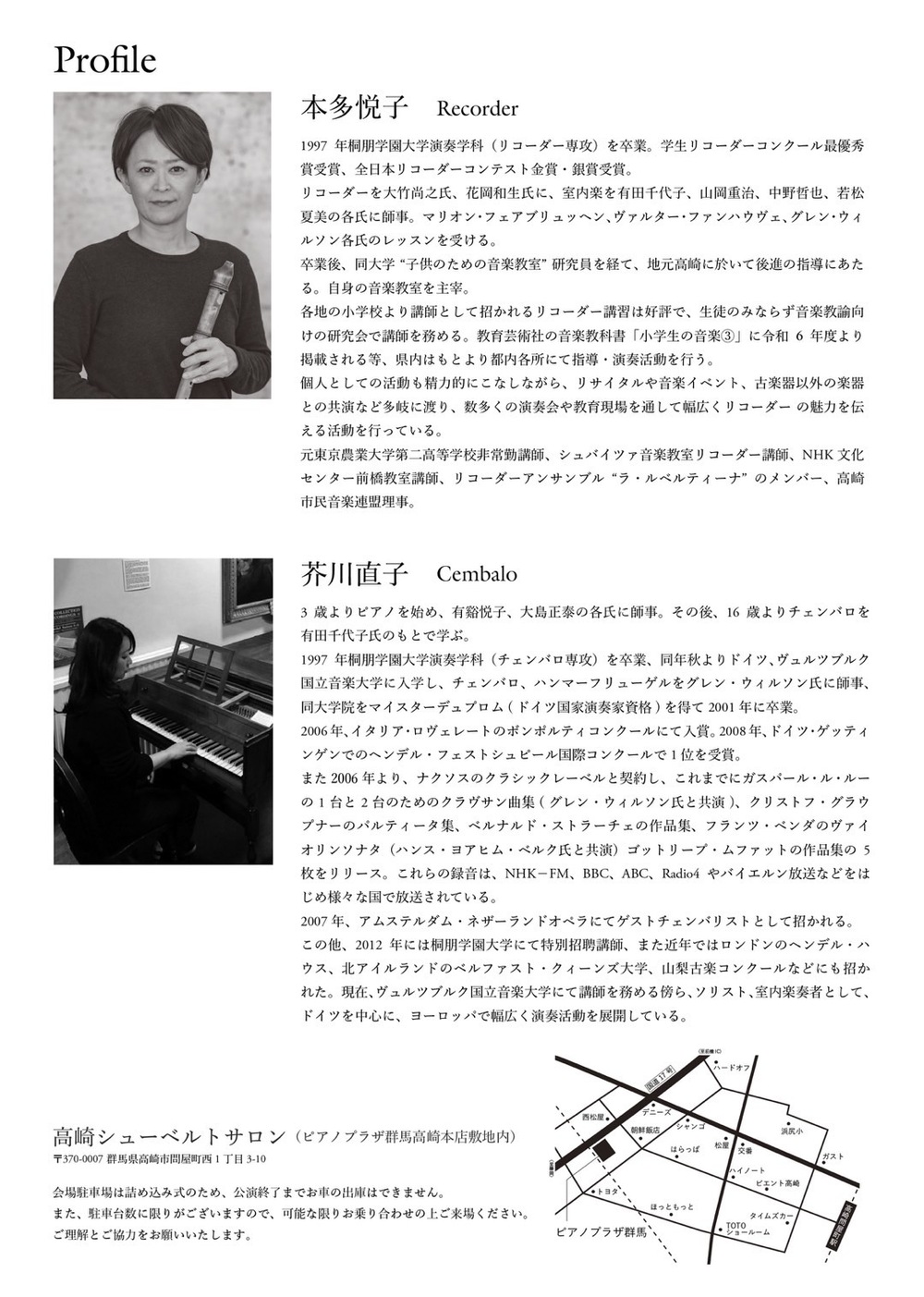 地元高崎在住のリコーダー奏者本多悦子と、ドイツで活躍するチェンバロ奏者芥川直子のバロックコンサート。バロックが華やいだ18世紀のイタリア、ドイツ、フランスの音楽を、サロンという空間で身近に感じられるプログラムとなっています。リコーダーとチェンバロの音色でしばし日常から離れてみてはいかがでしょうか…