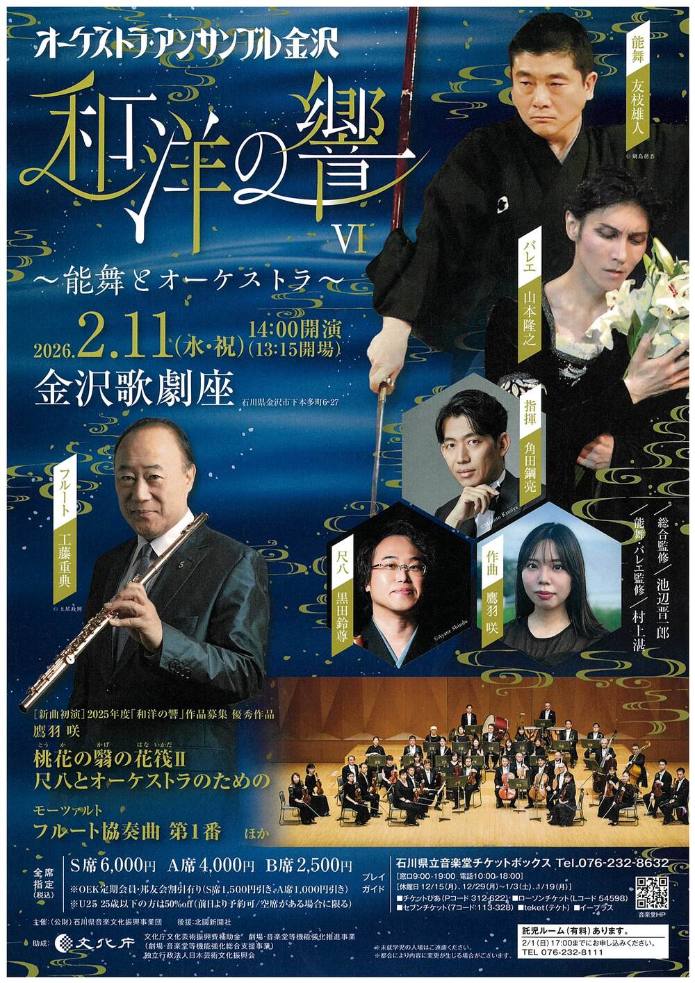本公演でも「能舞とオーケストラ」作品を募集し、審査員 池辺晋一郎氏(石川県立音楽堂エグゼクティブ・ミュージック・ディレクター)、角田鋼亮氏により選ばれた1曲を、OEKの演奏とシテ方喜多流能楽師 友枝隼人、バレエダンサー山本隆之(元・新国立劇場バレエ団プリンシパル)、尺八 黒田鈴尊の共演により初演いたします。