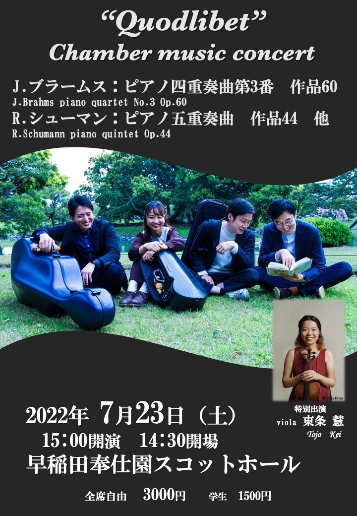 2021年8月に初回演奏会を開催したピアノトリオです。団体名の“Quodlibet”は「好きなように、自由気ままに」という意味です。