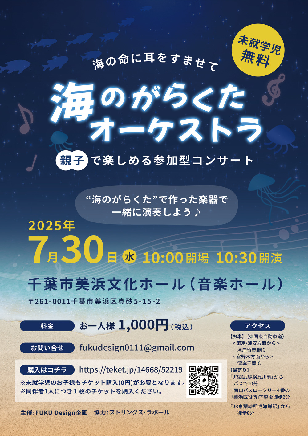 魚のプロが教える「海の命」について見て聞いて学べる市場体験と、海のがらくたを使った楽器を自分で作って演奏に参加できるコンサート体験の両方が楽しめるイベントです♪