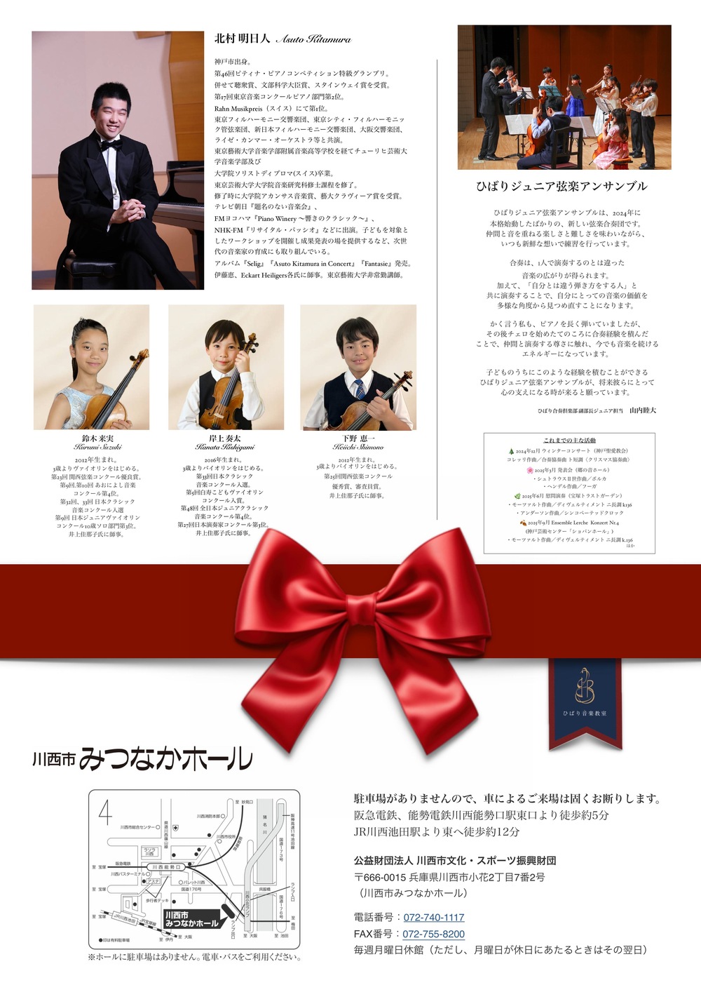 また今回は講師の演奏に加え、当教室に通う生徒を中心とした「ひばりジュニア弦楽アンサンブル」も演奏いたします。