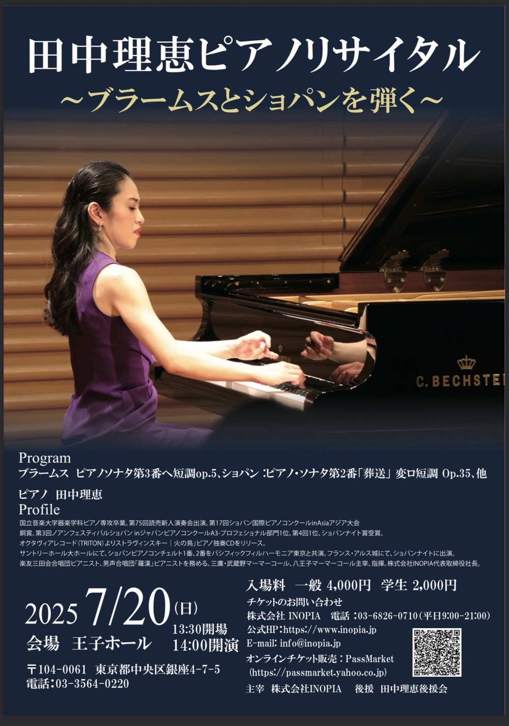 7月20日(日)銀座王子ホールにて、ブラームス『ピアノソナタ3番』ショパン『ピアノソナタ2番』をメインにピアノリサイタルを行います。