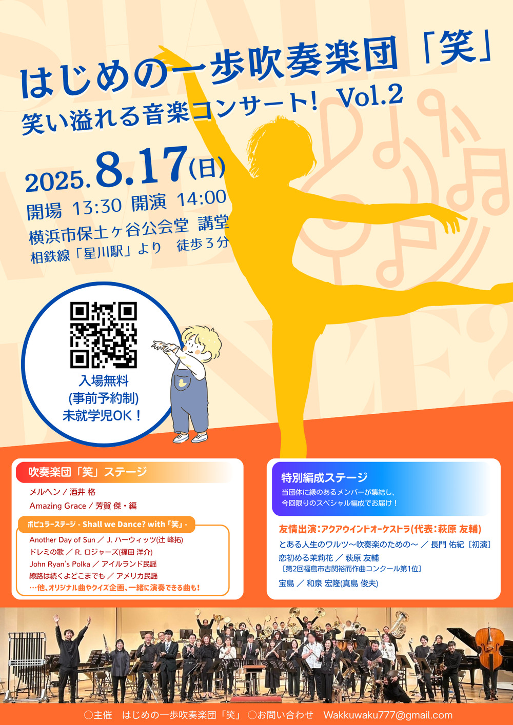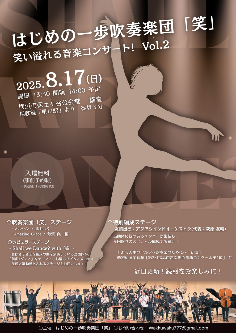 代表長門による『とある人生のワルツ』の初演と、萩原 友輔氏による『恋初める茉莉花』の再演を、「笑」や代表に縁のある奏者やバンドをお呼びした“特別編成ステージ”でお届けいたします!大きな編成で大迫力の「あの有名な」ポップス曲の演奏(編曲初演...!?)も控えていますので...乞うご期待っ!!!🔥