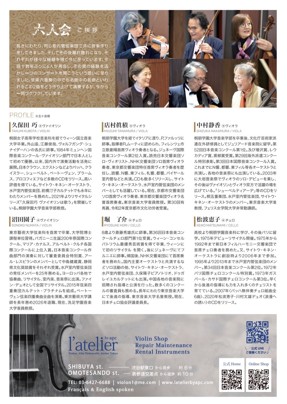 久保田 巧(Vn) 沼田園子(Vn) 店村眞積(Va) 中村静香(Va) 堀 了介(Vc) 松波恵子(Vc)